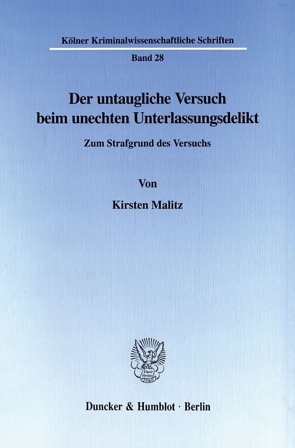 Die Autorin nimmt in der vorliegenden Arbeit die Entscheidung BGHSt. 38, 356 ff. zum Anlaß, die Rechtsfigur des untauglichen Versuchs beim unechten Unterlassungsdelikt einer näheren Betrachtung zuzuführen. Im Rahmen der Untersuchung, die zentrale Fragestellung...