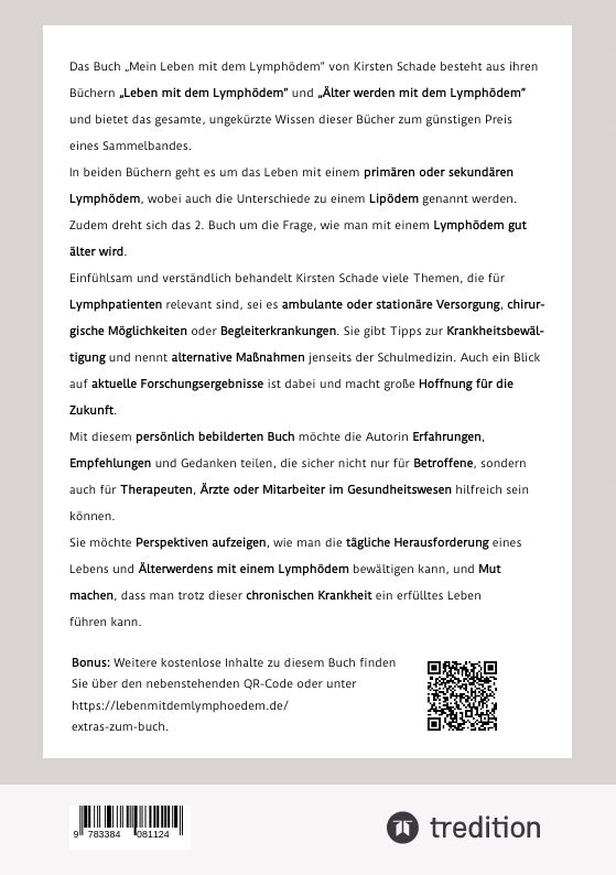 Das Buch Mein Leben mit dem Lymphödem von Kirsten Schade besteht aus ihren Büchern Leben mit dem Lymphödem und Älter werden mit dem Lymphödem und bietet das gesamte, ungekürzte Wissen dieser Bücher zum günstigen Preis eines Sammelbandes. In beiden Büchern geht...
