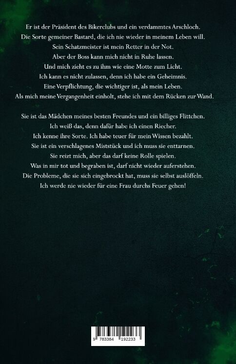 Er ist der Präsident des Bikerclubs und ein verdammtes Arschloch. Die Sorte gemeiner Bastard, die ich nie wieder in meinem Leben will. Sein Schatzmeister ist mein Retter in der Not. Aber der Boss kann mich nicht in Ruhe lassen. Und mich zieht es zu ihm wie ein...