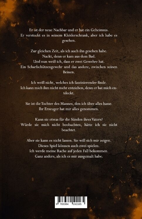 Er ist der neue Nachbar und er hat ein Geheimnis. Er versteckt es in seinem Kleiderschrank, aber ich habe es gesehen. Zur gleichen Zeit, als ich auch ihn gesehen habe. Nackt, denn er kam aus dem Bad. Und nun weiß ich, dass er zwei Gewehre hat. Ein Scharfschütz...