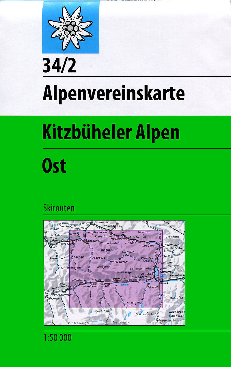 Topographische Karte 1:50.000, mehrfarbig, mit Skirouten, Bushaltestellen, Schummerung, Felszeichnung, Gletscherdarstellung, Kennzeichnung der Klettersteige, UTM-Gitter. Gebiet der östlichen Kitzbüheler Alpen mit Mittersill, Kitzbühel, Zell am See. Mit Skirout...