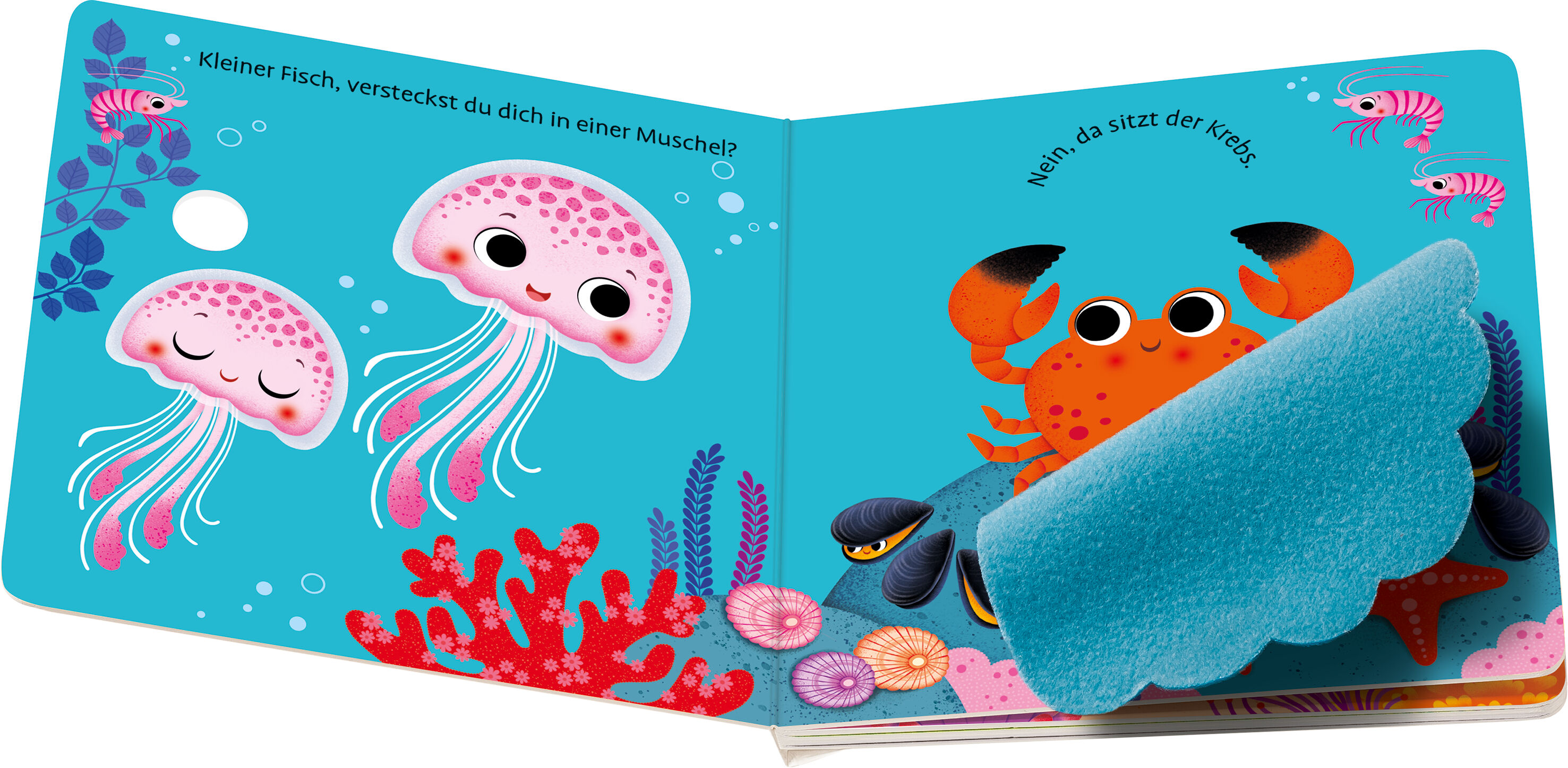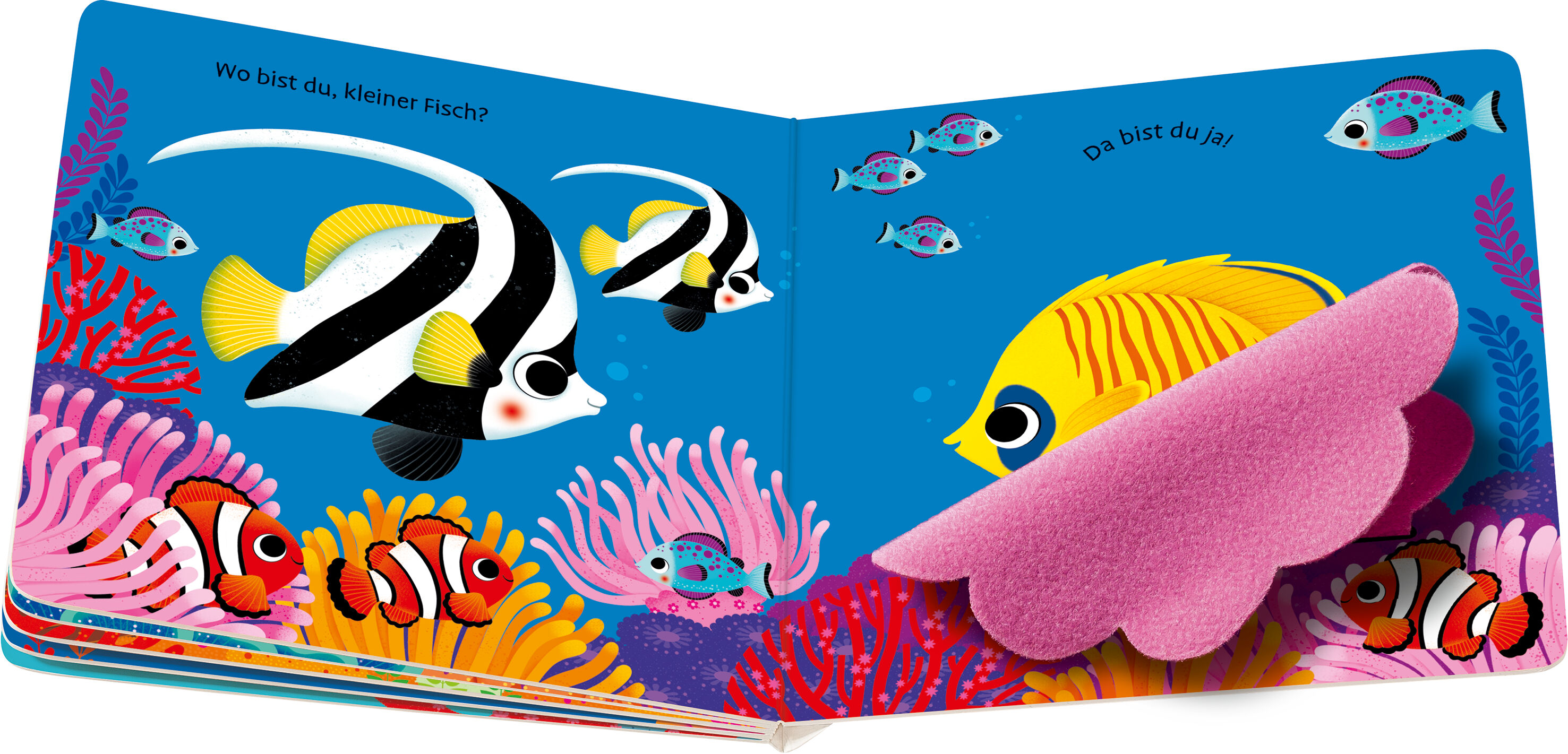 Fühlen, Entdecken und Staunen: Mein erstes Filzklappenbuch Hier im Meer so leben viele bunte Tiere! Aber einige davon haben sich gut versteckt, so wie der kleine Fisch. Bereits kleine Kinderhände öffnen spielend leicht die stabilen, speichelfesten Fühlklappen ...