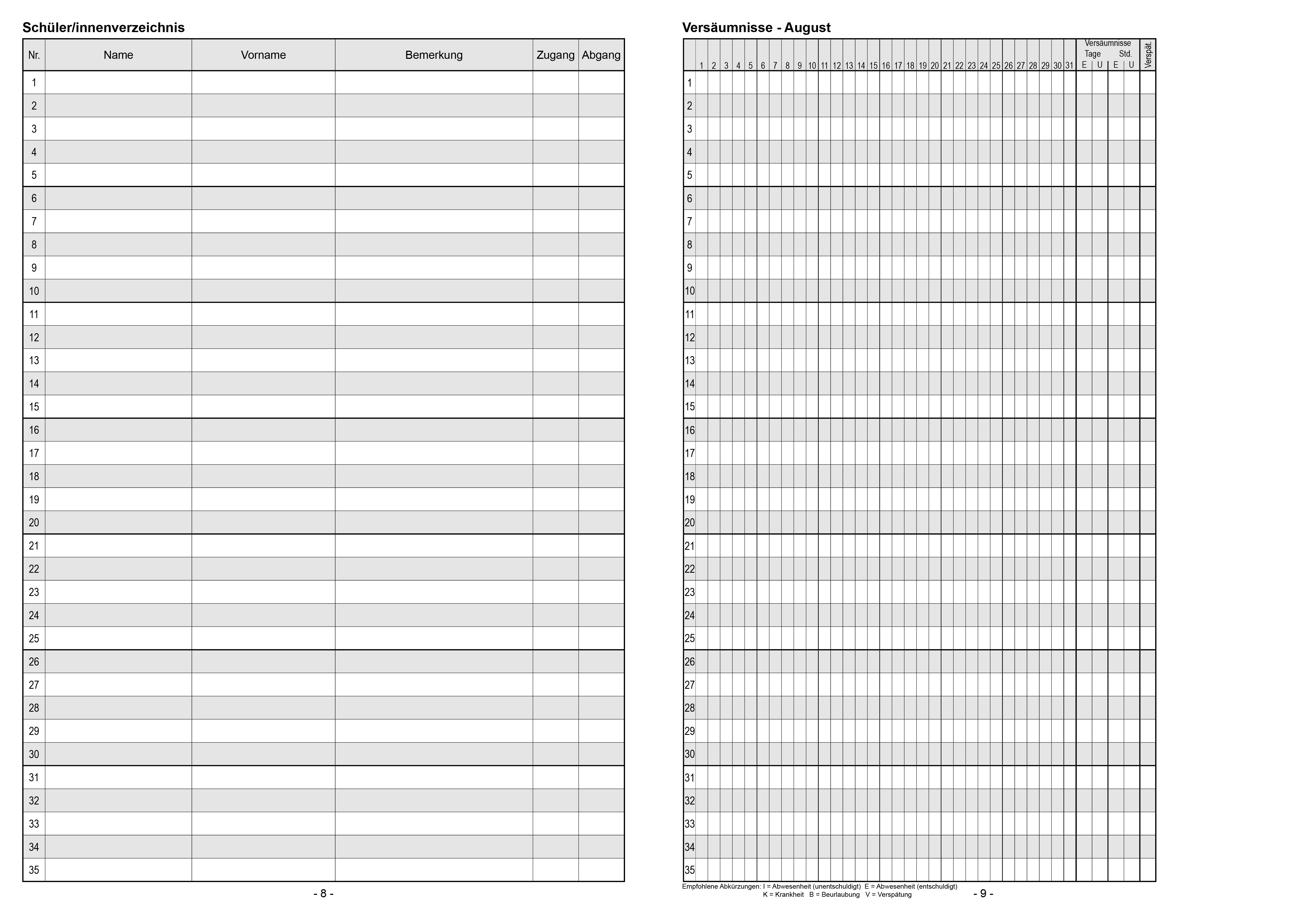 Klassenbuch "Standard" mit festem Bucheinband - für 1 Schuljahr Inhalt: Stundenpläne, Lehrer- und Schülerverzeichnis, monatliche Versäumnisse im Registerschnitt, Wahlunterricht, AG's, Übersicht schriftliche Arbeiten, eingeführte Schulbücher, ausgegebene Lehrmi...
