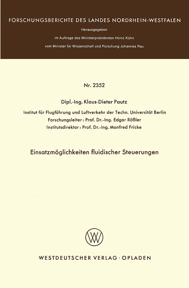 In einer zusammenfassenden Ubersicht wurde die fluidische Sig nalverarbeitungstechnik mit anderen moglichen Verfahren vergli chen. Es zeigten sich hierbei insbesondere Anwendungsmoglichkei ten fUr die Fluidik in der Luft- und Raumfahrt. Unter der Be rUcksichti...