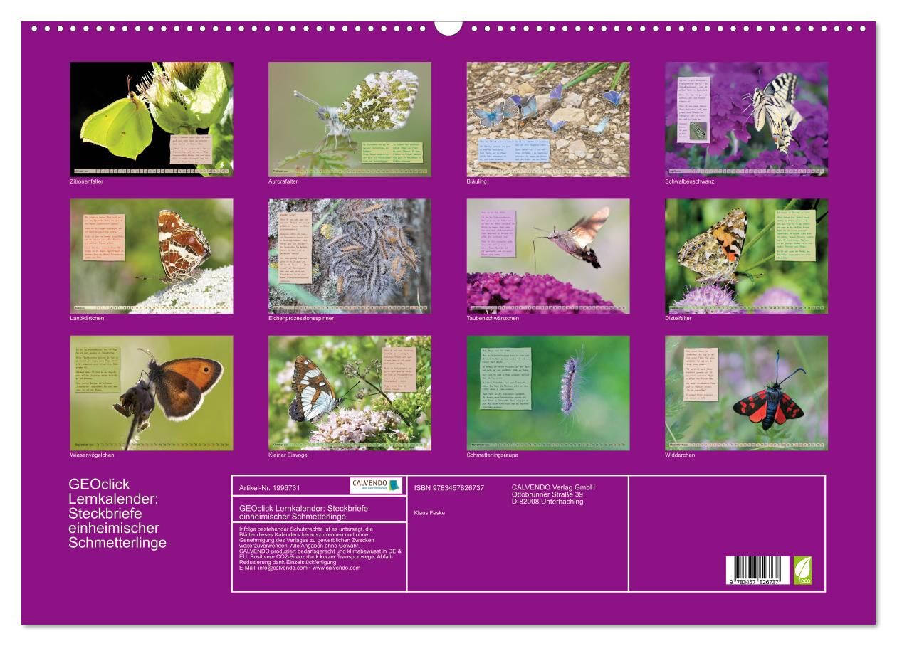 Dieser Lernkalender zeigt Szenen aus dem Schmetterlingsleben. Die Tiere stellen sich mit einem kurzen, kindgerechten Text selbst vor. In dieser Reihe sind bereits weitere Kalender über heimische Vögel, Wildtiere, Kriechtiere und Lurche sowie exotische Tiere er...