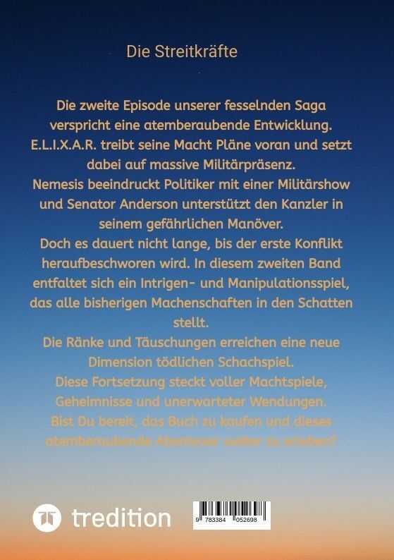 Die Saga nimmt Fahrt auf! Im zweiten Band unserer epischen Geschichte nimmt E.L.I.X.A.R. einen gigantischen Schritt vorwärts in seinem Streben nach Macht und Sicherheit. Diesmal erteilt er Nemesis den beunruhigenden Auftrag, die Streitkräfte zu mobilisieren un...
