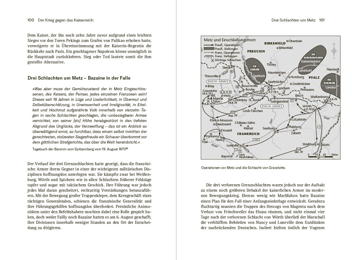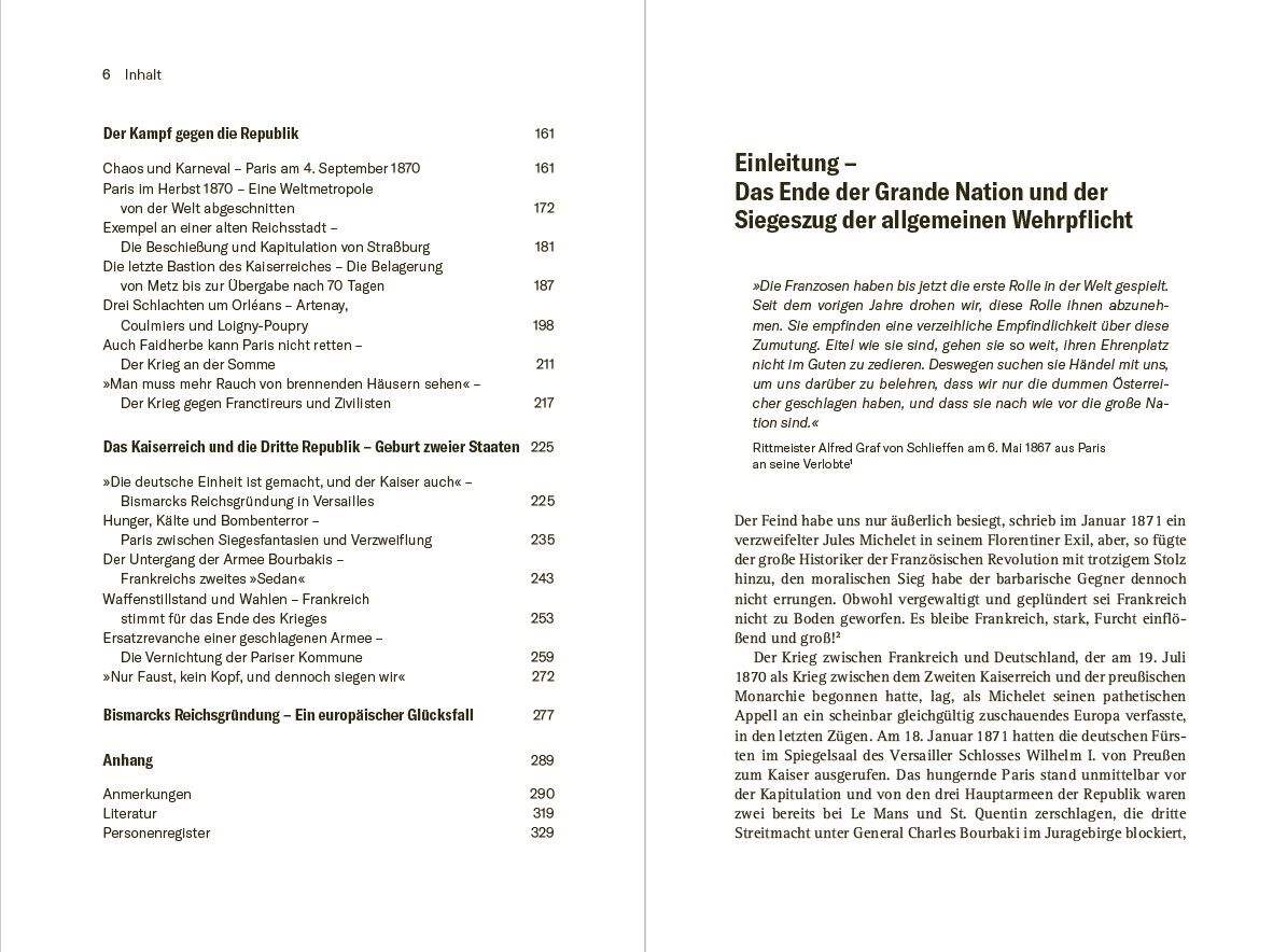Inhalt Einleitung Das Ende der Grande Nation und der Siegeszug der allgemeinen Wehrpflicht 7 Bis zum ersten Schuss 15 Paris 1867 Das Zweite Kaiserreich noch einmal als Mittelpunkt Europas 15 Preußisches Prävenire Erzherzog Albrechts geheime Reise nach Paris und die spanische Thronkandidatur 27 Zwei Nationen und ein überraschender Krieg 46 Der Weg nach Sedan Das Preußische Heer und das Militär des Norddeutschen Bundes im Zeitalter von Heeresreorganisation und Einigungskriegen 56 Der Krieg gegen das Kaiserreich 67 Frankreich »wurstelt sich durch« Marschall Edmond Leboeufs großes Aufmarschfiasko 67 Die Franzosen kommen nicht Der Aufmarsch der verbündeten deutschen Armeen im Juli 1870 77 Die ersten Siege Weißenburg, Wörth und Spichern 85 Drei Schlachten um Metz Bazaine in der Falle 100 Sedan Der Marsch der Armee von Chalons in den Untergang 115 Hungrig, frierend, ahnungslos Die Soldaten im Feld 133 Finanzmisere, Frauenvereine und Friedenssehnsucht Die Heimatfront 149 Der Kampf gegen die Republik 161 Chaos und Karneval Paris am 4. September 1870 161 Paris im Herbst 1870 Eine Weltmetropole von der Welt abgeschnitten 172 Exempel an einer alten Reichsstadt Die Beschießung und Kapitulation von Straßburg 181 Die letzte Bastion des Ka…