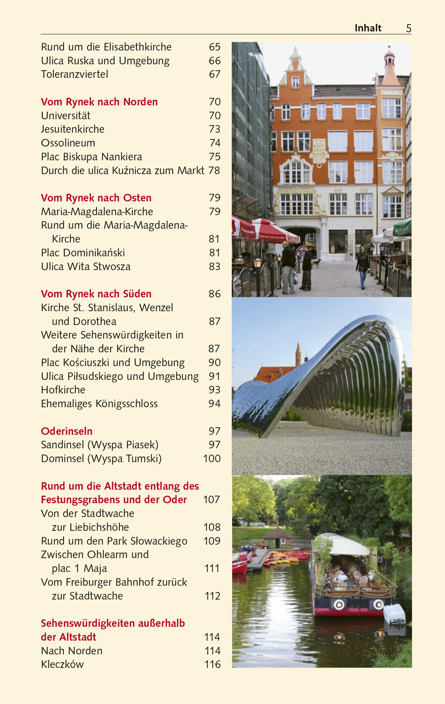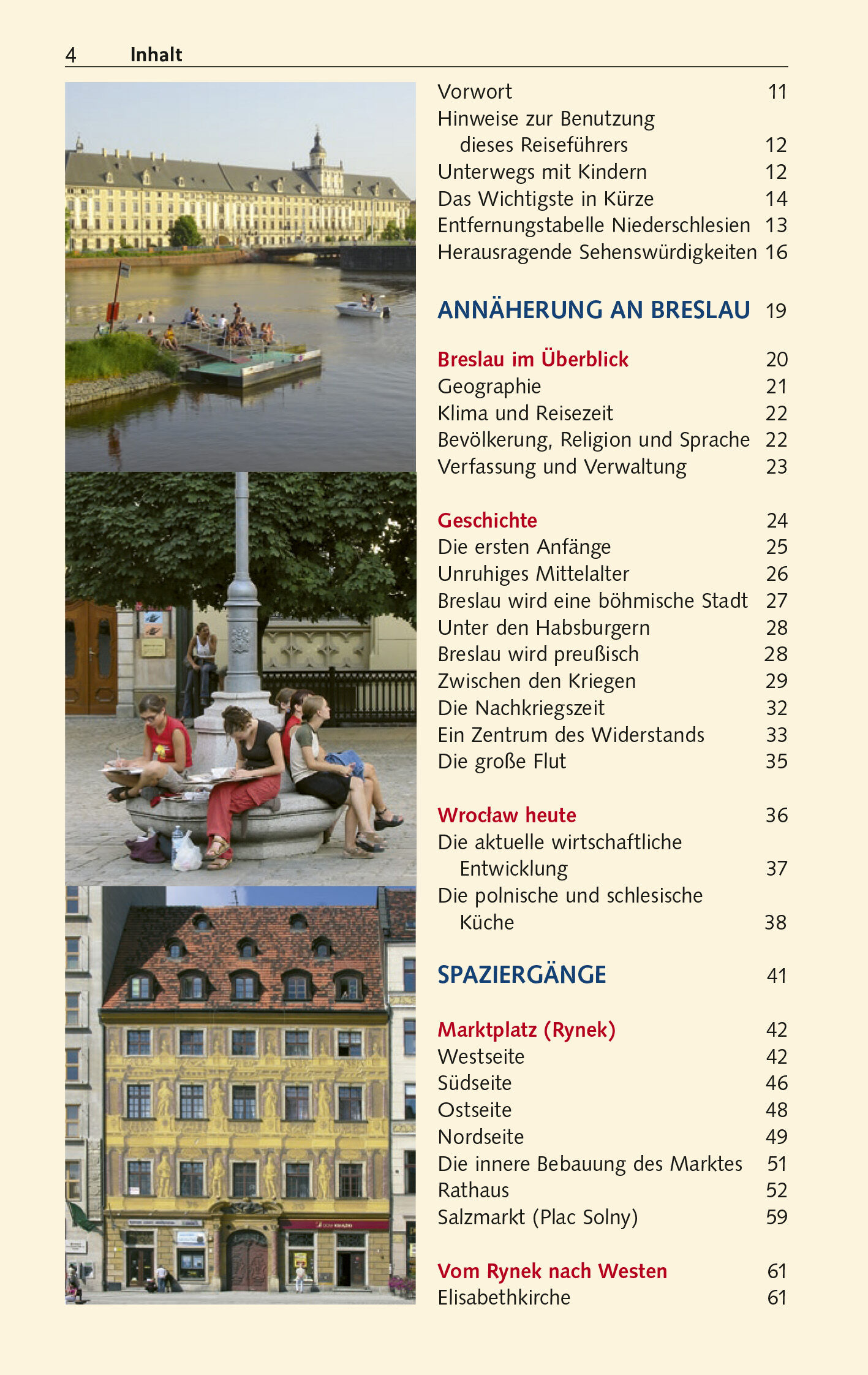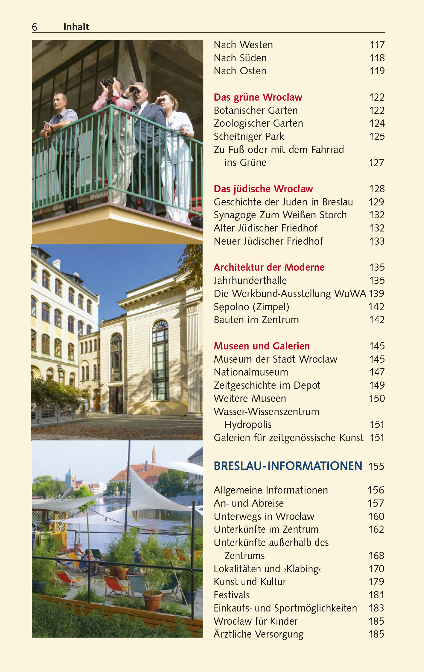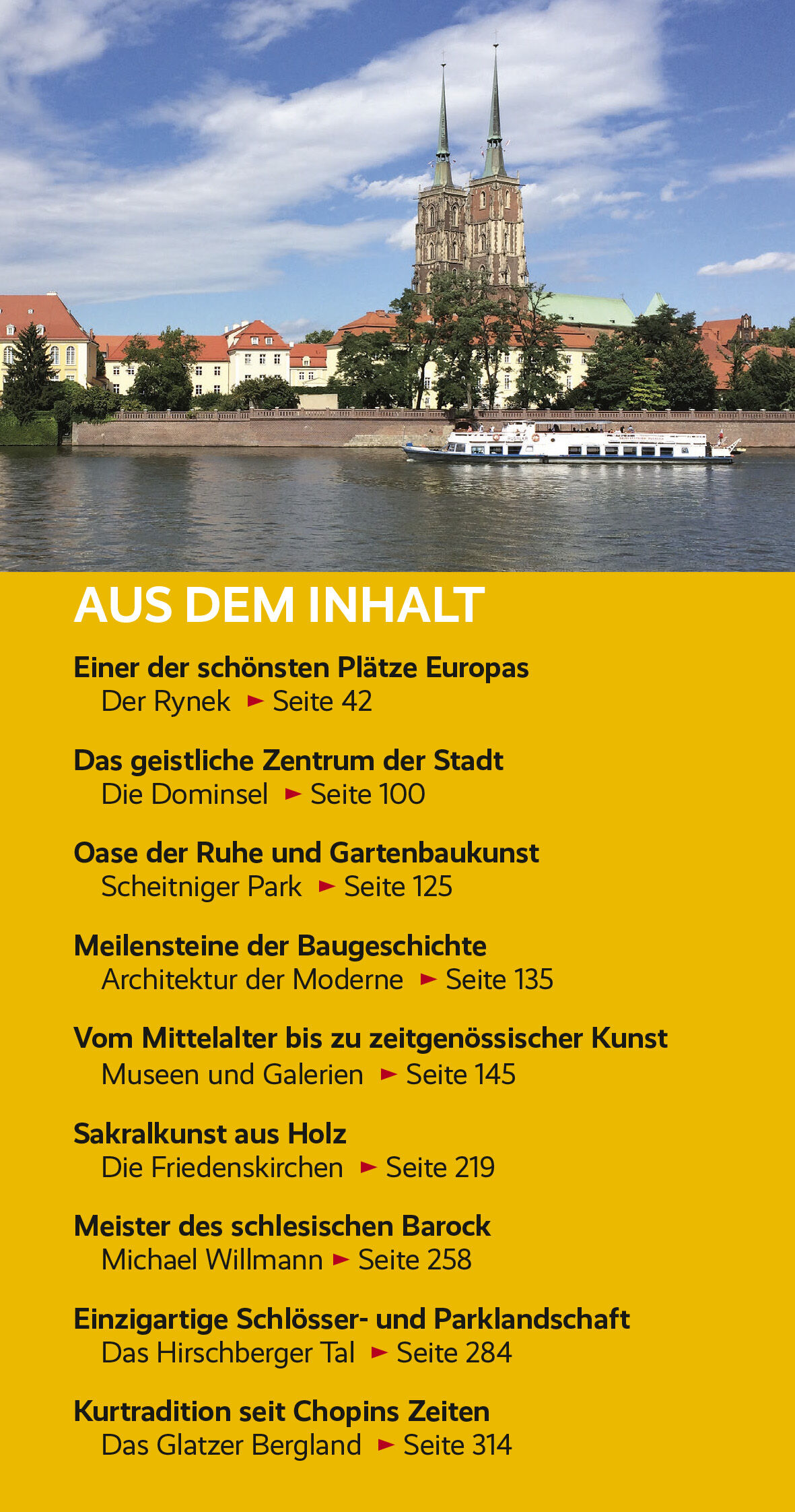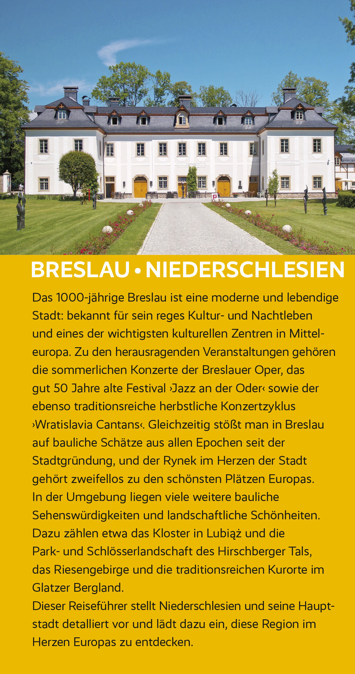 Seite 42 DAS GEISTLICHE ZENTRUM DER STADT Die Dominsel > Seite 100 OASE DER RUHE UND GARTENBAUKUNST Scheitniger Park > Seite 125 MEILENSTEINE DER BAUGESCHICHTE Architektur der Moderne > Seite 135 VOM MITTELALTER BIS ZU ZEITGENÖSSISCHER KUNST Museen und Galerien > Seite 145 SAKRALKUNST AUS HOLZ Die Friedenskirchen > Seite 219 MEISTER DES SCHLESISCHEN BAROCK Michael Willmann > Seite 258 EINZIGARTIGE SCHLÖSSER- UND PARKLANDSCHAFT Das Hirschberger Tal > Seite 284 KURTRADITION SEIT CHOPINS ZEITEN Das Glatzer Bergland > Seite 314 Das 1000-jährige Breslau ist eine moderne und lebendige Stadt: bekannt für sein reges Kultur- und Nachtleben und eines der wichtigsten kulturellen Zentren in Mitteleuropa. Zu den herausragenden Veranstaltungen gehören die sommerlichen Konzerte der Breslauer Oper, das gut 50 Jahre alte Festival Jazz an der Oder sowie der ebenso traditionsreiche herbstliche Konzertzyklus Wratislavia Cantans. Gleichzeitig stößt man in Breslau auf bauliche Schätze aus allen Epochen seit der Stadtgründung, und der Rynek im Herzen der Stadt gehört zweifellos zu den schönsten Plätzen Europas. In der Umgebung liegen viele weitere bauliche Sehenswürdigkeiten und landschaftliche Schönheiten. Dazu zählen etwa das Kloster in Lubi und die Park- und Schlösserlandschaft des Hirschberger Tals, das Riesengebirge und die traditionsreichen Kurorte im Glatzer Bergland. Dieser Reiseführer stellt Niederschlesien und seine Hauptstadt detalliert vor und lädt dazu ein, diese Region im Herzen Europas zu entdecken. >>> Weitere Reiseführer zu Osteuropa finden Sie auf der Website des Trescher Verlags.