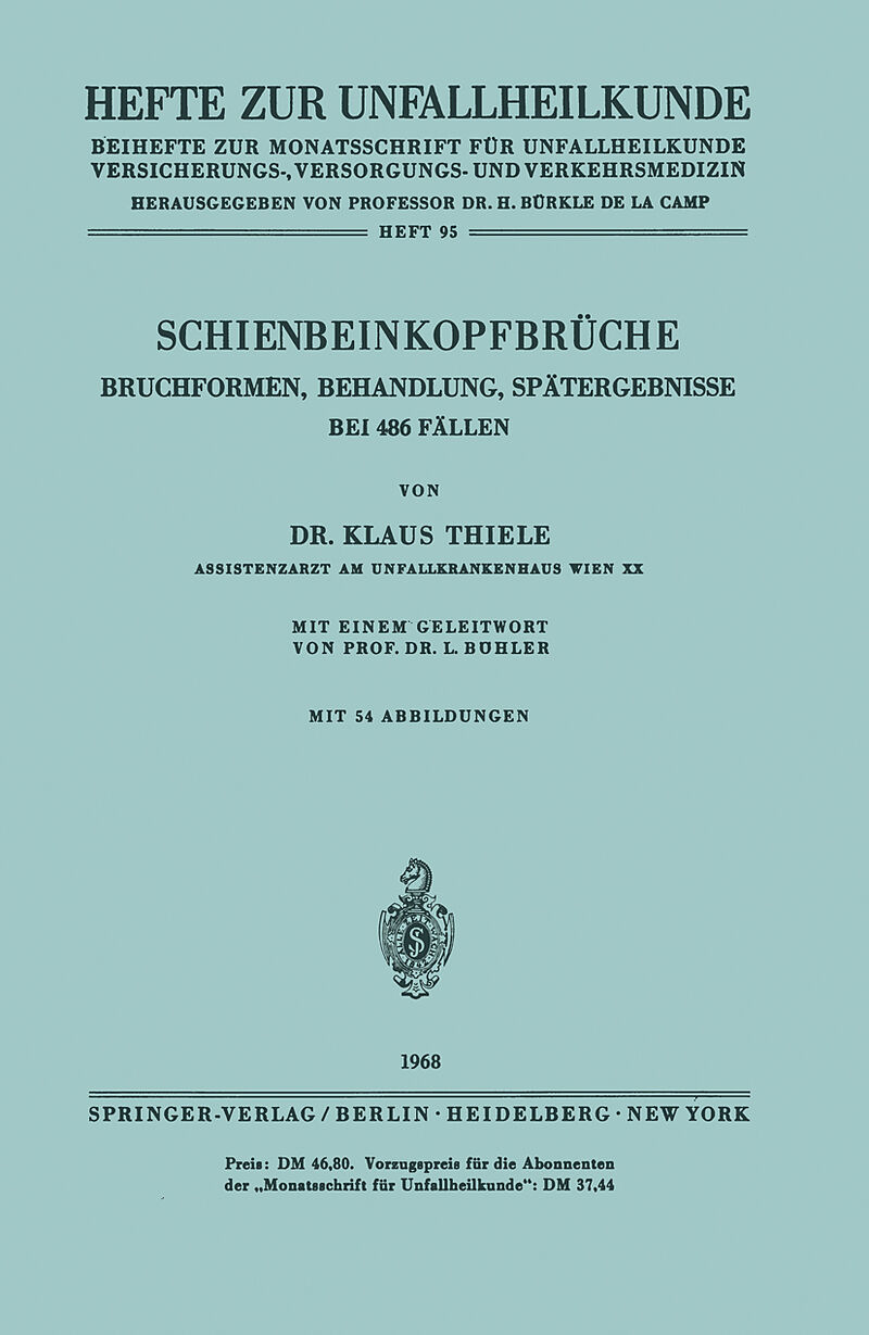 Seit Jahrzehnten interessiere ich mich fiir die Ergebnisse verschie dener Behandlungsmethoden von Verletzungen. KLAUS TmELE hat in jahrelanger miihevoller Arbeit 486 Briiche des Schienbeinkopfes nach den verschiedensten Richtungen sorgfaltig durchgearbeitet un...Seit Jahrzehnten interessiere ich mich fiir die Ergebnisse verschie dener Behandlungsmethoden von Verletzungen. KLAUS TmELE hat in jahrelanger miihevoller Arbeit 486 Briiche des Schienbeinkopfes nach den verschiedensten Richtungen sorgfaltig durchgearbeitet und zusam mengestellt. Die Durchfiihrung dieser Arbeit war nur moglich, weil im Unfallkrankenhaus Wien XX von allen seit Bestehen des Rauses sta tionar und ambulant behandelten Verletzten mit Schreibmaschine ge schriebene Anfangsbefunde, Krankengeschichten und Endbefunde sowie samtliche angefertigten Rontgenbilder geordnet vorhanden sind. Von der Griindung des Rauses Wien XX im Jahre 1925 bis ZUlli Jahre 1956 wurden auf die einzelnen Korperregionen aufgeschliisselte Frakturen und Luxationsprotokolle mit den Skizzen der primaren Rontgenbilder und den wichtigsten Daten eines jeden Falles gefUhrt. Seit 1956 wird von jedem Verletzten eine Lochkarte angelegt. Diese beiden Einrichtun gen gestatten es, die Unterlagen einer beliebigen Gruppe von Verletzten jederzeit zur Bearbeitung herauszusuchen. Die Allgemeine Unfallversicherungsanstalt hat die bei der Anferti gung dieser Arbeit entstandenen, nicht unbetrachtlichen Kosten iiber nommen und ihre Einrichtungen (Rontgenabteilung, Rollerithabteilung, Rentenabteilung und Photolabor) in dankenswerter Weise zur Verfiigung gestellt. Sie hat damit der Tatsache Rechnung getragen, daB iiber den Wert oder Unwert einer Behandlungsmethode nur die Spatergebnisse AufschluB geben konnen und die Nachuntersuchung einer groBen Anzahl von Verletzten eine der wesentlichsten Forschungsmethoden der Unfall chirurgie darstellt. In diesem Sinne sind die im Besitz des Unfallkrankenhauses Wien XX und der Allgemeinen Unfallversicherungsanstalt befindlichen Unterlagen von mehr als einer Million im Unfallkrankenhaus behandelten Verletzten eine Sammlung von besonderem Wert.