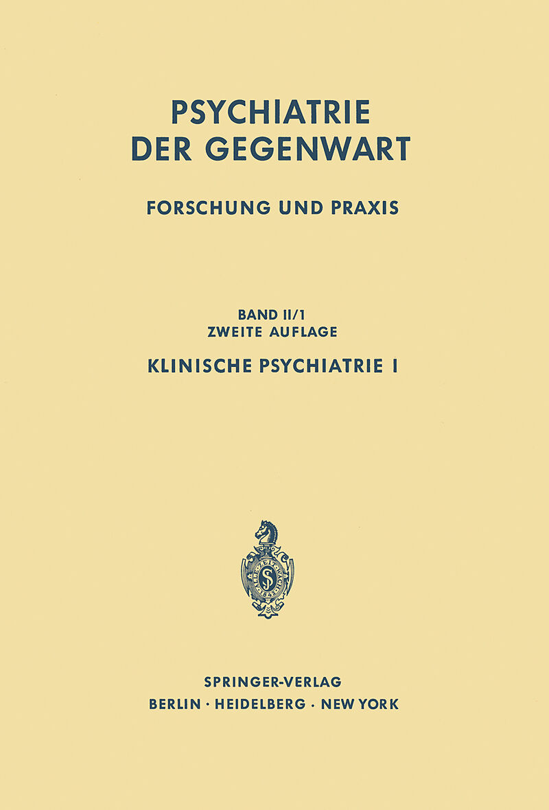 1.- A. Endogene Psychosen.- Klinik der schizophrenen Geistesstörungen.- Depressive und manische endogene Psychosen.- Atypische Psychosen. Reaktive (psychogene) Psychosen.- Paranoide Syndrome.- Aufteilung der endogenen Psychosen in der Forschungsrichtung von Wernicke und Kleist.- Epidemiology of the Psychoses.- Die Somatotherapie endogener Psychosen vom depressiven und manischen Typ..- Psychotherapie und Soziotherapie der endogenen Psychosen..- B. Neurosen, Psychopathien, abnorme Reaktionen und Entwicklungen.- Psychopathie-Neurose (Einleitung).- Klinik der Neurosen.- Psychopathien.- Abnorme Reaktionen und Entwicklungen.- Die sexuellen Verirrungen.- Psychosomatische Syndrome.- Klassifikationen von Neurotisch-Kranken (Taxonomien) und von Neurose-Symptomen (Nosologien).- Les psychothérapies analytiques.- Die allgemeine Psychotherapie des Nervenarztes.- Behaviour Therapy.- Rehabilitation bei Neurosen und Charakterstörungen.- C. Kinder- und Jugendpsychiatrie.- Psychopathologie und Klinik des Jugendalters, der Pubertät und Adoleszenz.- Die sozialen Anpassungsstörungen des Kindes- und Jugendalters.- Psychosen im Kindesalter.- Die Psychopathologie der Hirnschädigung im Kindesalter.- Die Therapie im Kindes- und Jugendalter.- Namenverzeichnis.