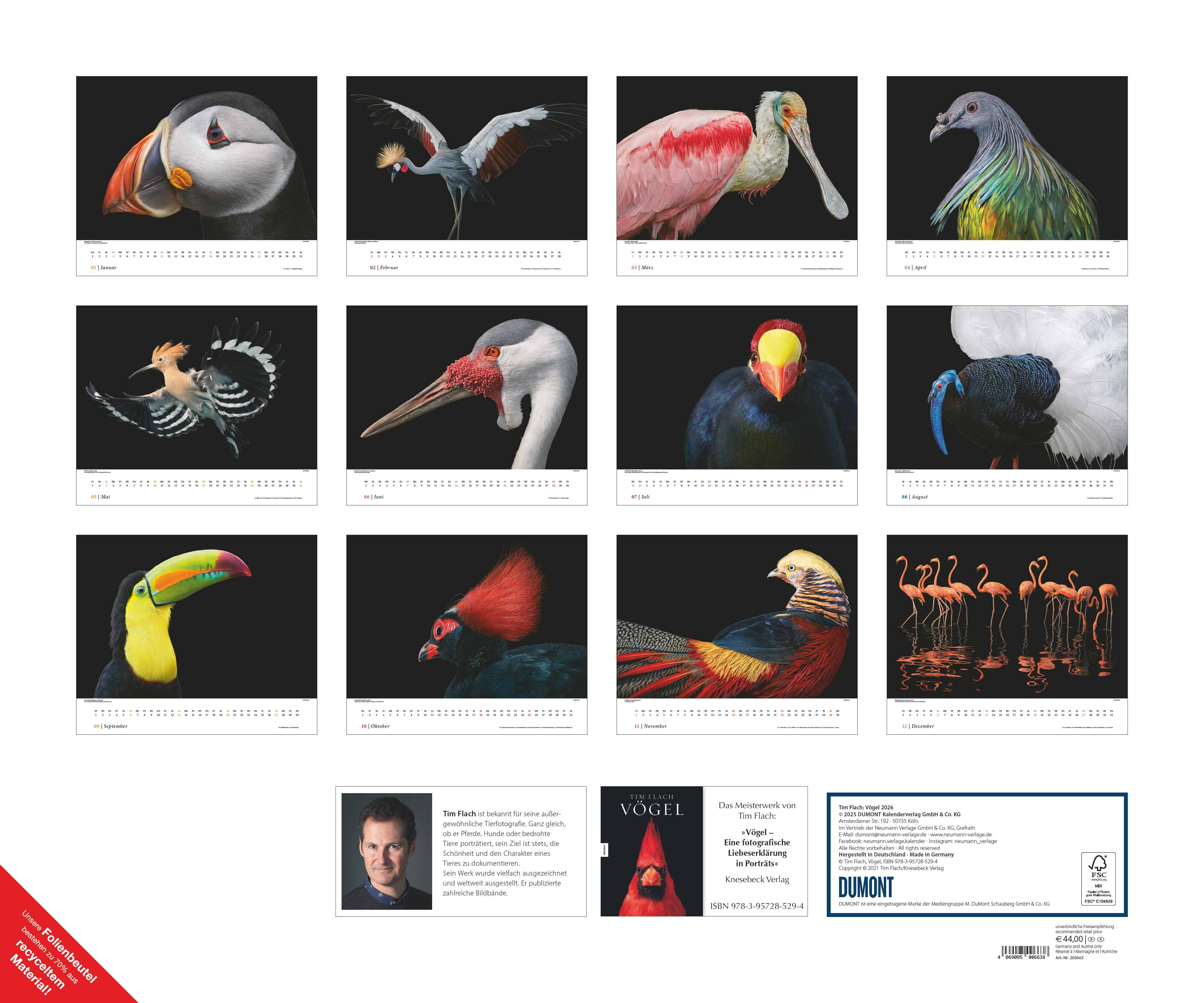 Entdecken Sie die außergewöhnlichen Vogel-Porträts des weltberühmten Tierfotografen Tim Flach in diesem großformatigen DUMONT Posterkalender 2026. Intensive Aufnahmen, die die Schönheit und den Charakter der Vögel einzigartig einfangen. Highlights: 12 brillan...