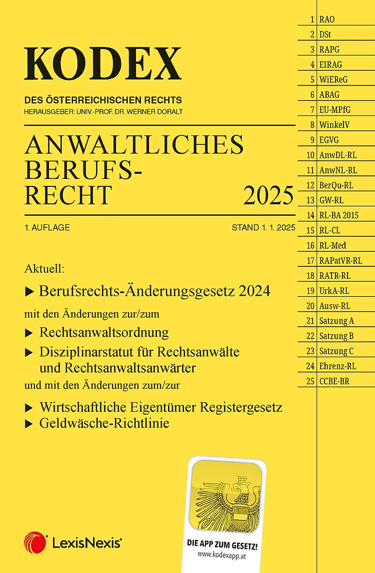 Der neue KODEX Anwaltliches Berufsrecht , Stand 1.1.2025 Kompakt und leicht auffindbar umfasst er internationale, europäische und nationale Rechtsnormen, die für die Ausübung des Rechtsanwaltsberufs wesentlich sind. Diese Gesetzessammlung soll daher ein zentr...