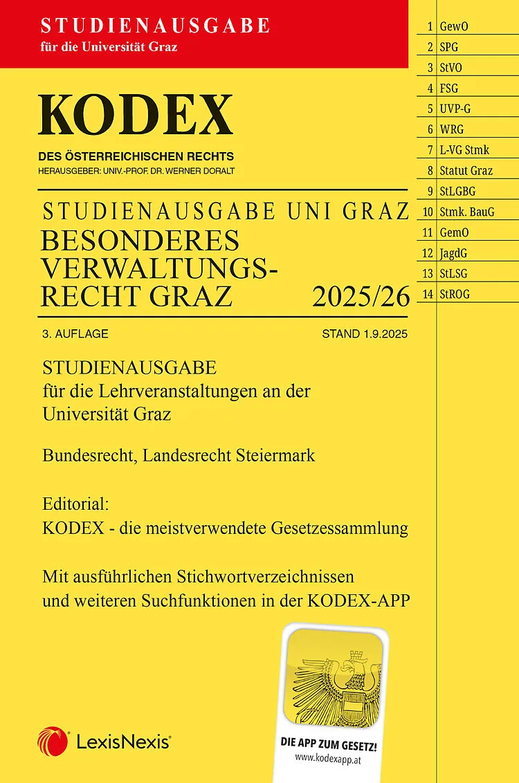 Kodex Besonderes Verwaltungsrecht Graz 3. Auflage mit Stand 1.9.2025 enthält: STUDIENAUSGABE für die Lehrveranstaltungen an der Universität Graz Bundesrecht Landesrecht Steiermark Mit dem Kauf dieses Bandes erhalten Sie Zugriff auf diesen in der KODEX-App . D...