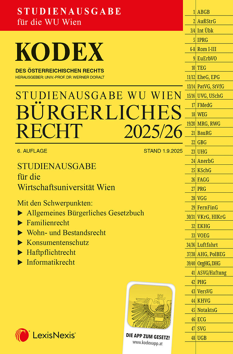 Der KODEX Bürgerliches Recht für die WU 2025/26 , 6. Auflage enthält alle relevanten Normen für zivilrechtliche Lehrveranstaltungen an der Wirtschaftsuniversität Wien, mit den Schwerpunkten: - Allgemeines Bürgerliches Gesetzbuch - Familienrecht - Wohn- und Be...