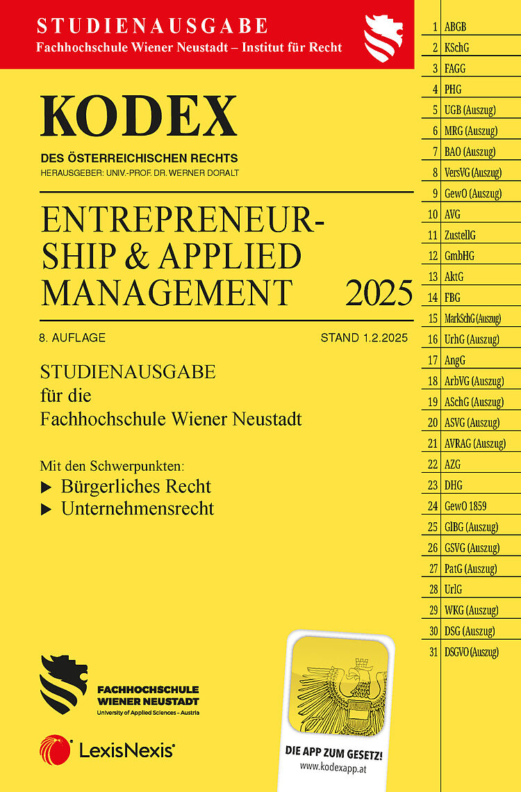 Der Kodex EAM, Entrepreneurship & Applied Management , 8. Auflage mit Stand 1. 2. 2025 Enthält die Schwerpunkte: Unternehmensrecht, die Gewerbeordnung und Arbeitsrecht STUDIENAUSGABE für die FH Wr. Neustadt Mit dem Kauf dieses Bandes erhalten Sie Zugriff ...