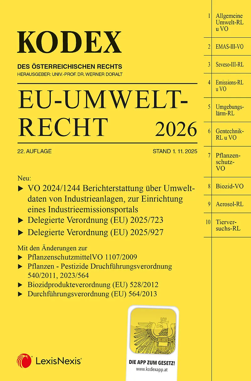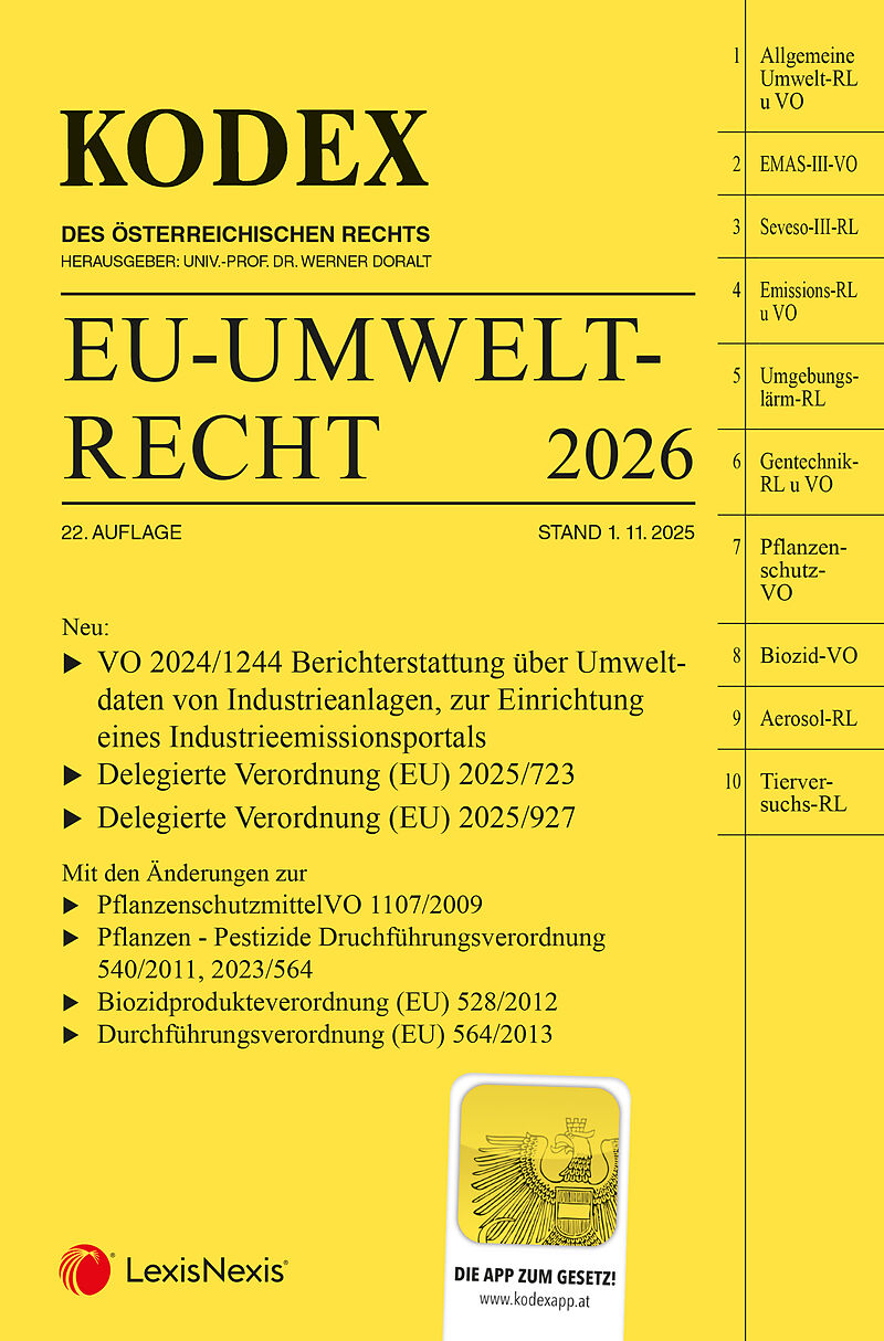 Der Kodex EU-Umweltrecht 22. Auflage mit Stand 1. 11. 2025 enthält: Neu: VO 2024/1244 Berichterstattung über Umweltdaten von Industrieanlagen, zur Einrichtung eines Industrieemissionsportals Delegierte Verordnung (EU) 2025/723 Delegierte Verordnung (EU) 2025/...