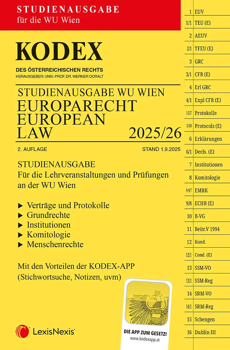 Der Kodex Studienausgabe EUROPARECHT / EUROPEAN LAW 2. Auflage mit Stand 1.9.2025 enthält: STUDIENAUSGABE für die europarechtlichen Lehrveranstaltungen an der WU Wien Verträge und Protokolle Grundrechte Institutionen Komitologie Menschenrechte ...