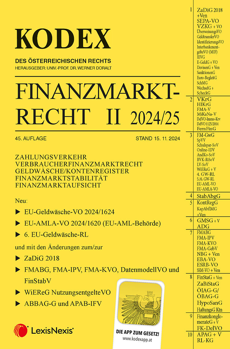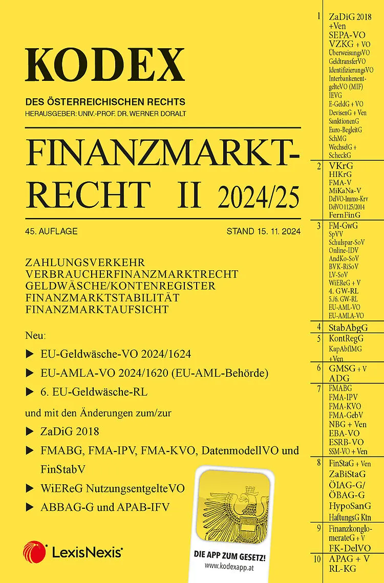 Der Kodex Finanzmarktrecht Band II, 45. Auflage, mit Stand 15. 11. 2024, enthält: ZAHLUNGSVERKEHR VERBRAUCHERFINANZMARKTRECHT GELDWÄSCHE/KONTENREGISTER FINANZMARKTSTABILITÄT FINANZMARKTAUFSICHT Neu: EU-Geldwäsche-VO 2024/1624 EU-AMLA-VO 2024/1620 (EU-AML-Behö...