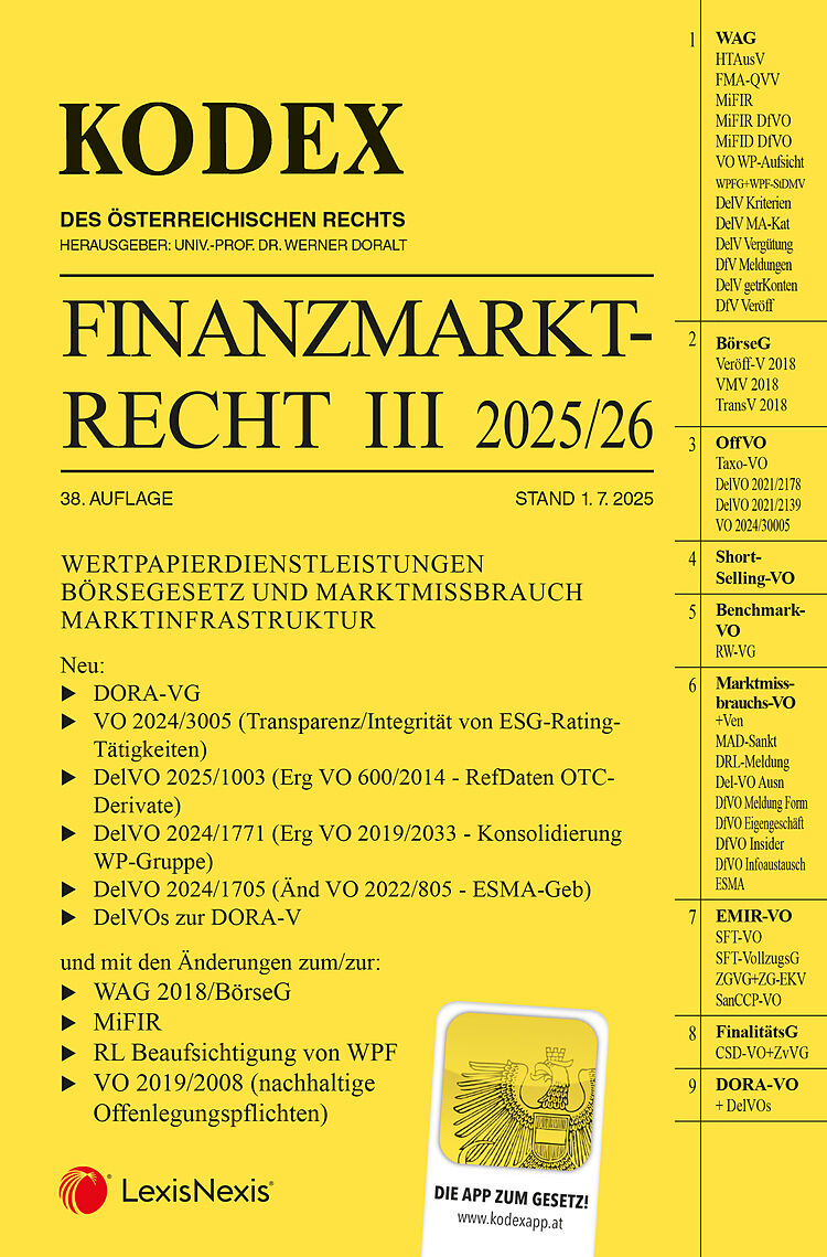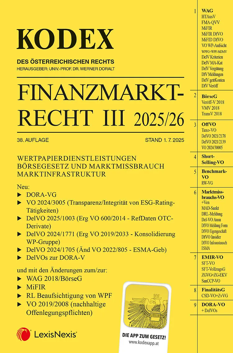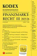 Der Kodex Finanzmarktrecht Band III 2025/26, 38. Auflage, Stand 1. 7. 2025, enthält: WERTPAPIERDIENSTLEISTUNGEN BÖRSEGESETZ UND MARKTMISSBRAUCH MARKTINFRASTRUKTUR Neu: DORA-VG VO 2024/3005 (Transparenz/Integrität von ESG-Rating-Tätigkeiten) DelVO 2025/1003 (E...