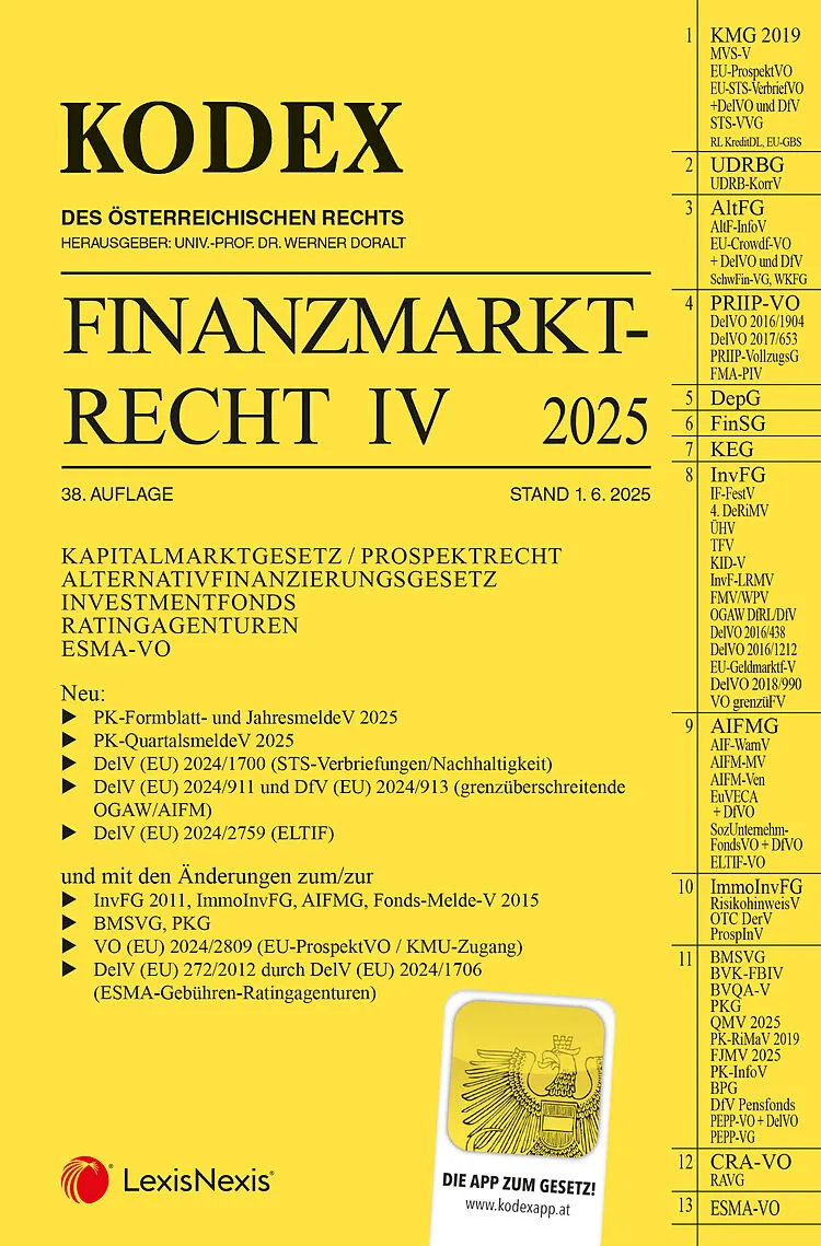 Der Kodex Finanzmarktrecht IV, 38. Auflage, Stand 1. 6. 2025, enthält: KAPITALMARKTGESETZ / PROSPEKTRECHT ALTERNATIVFINANZIERUNGSGESETZ INVESTMENTFONDS RATINGAGENTUREN ESMA-VO Neu: PK-Formblatt- und JahresmeldeV 2025 PK-QuartalsmeldeV 2025 DelV (EU) 2024/1700...