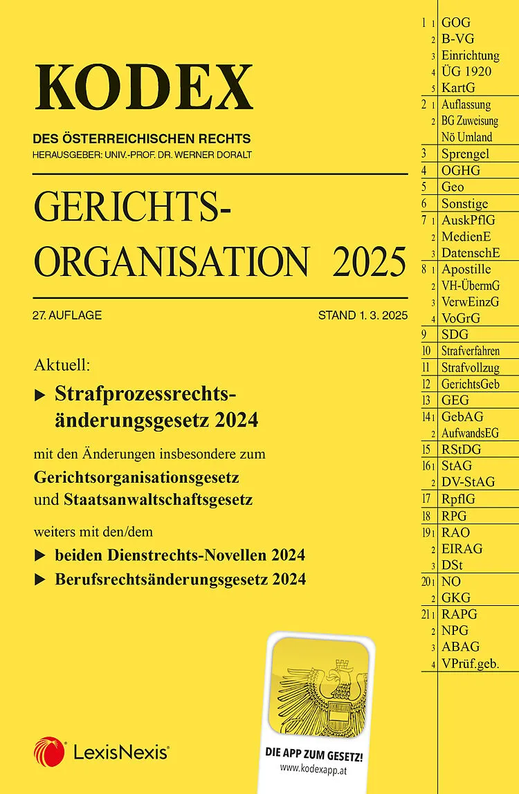 KODEX Gerichtsorganisation , 27. Auflage, Stand 1. 3. 2025 enthält alle für den Gerichtsbetrieb relevanten Bestimmungen wie das GOG , das OGHG , die Geschäftsordnung für die Gerichte I. und II. Instanz, Erlässe über Verständigungspflichten, GeschwSchG , RStDG...