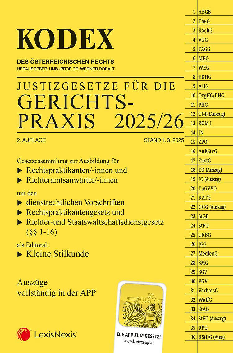 Der Kodex Gerichtspraxis 2025/26, 2. Auflage, Stand 1. 3. 2025, enthält: Gesetzessammlung zur Ausbildung für Rechtspraktikanten/-innen und Richteramtsanwärter/-innen mit den dienstrechtlichen Vorschriften Rechtspraktikantengesetz und Richter-und Staatswaltsch...