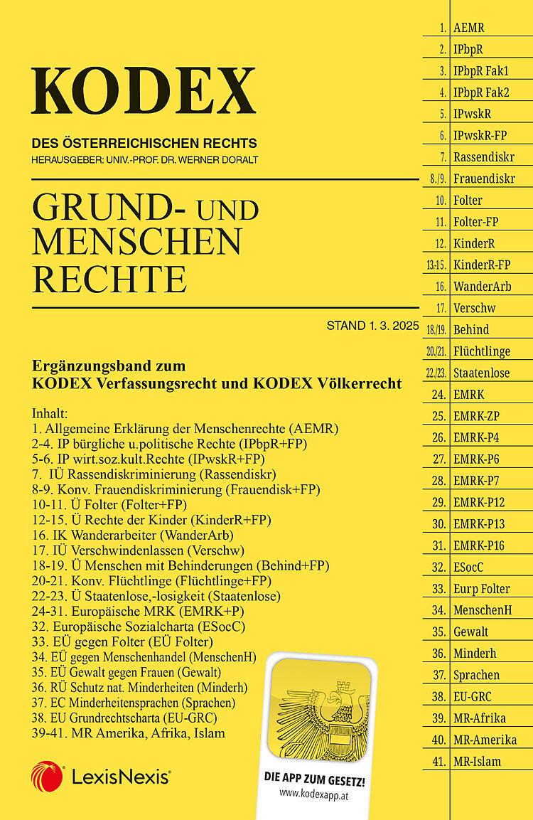 KODEX Grund- und Menschenrechte , 1. Auflage, Stand 1.3.2025 In dem neuen KODEX werden die maßgeblichen grund- und menschenrechtlichen Materialien möglichst einfach und übersichtlich zugänglich gemacht. Inklusive einer Übersichtstabelle mit den englischen Ori...
