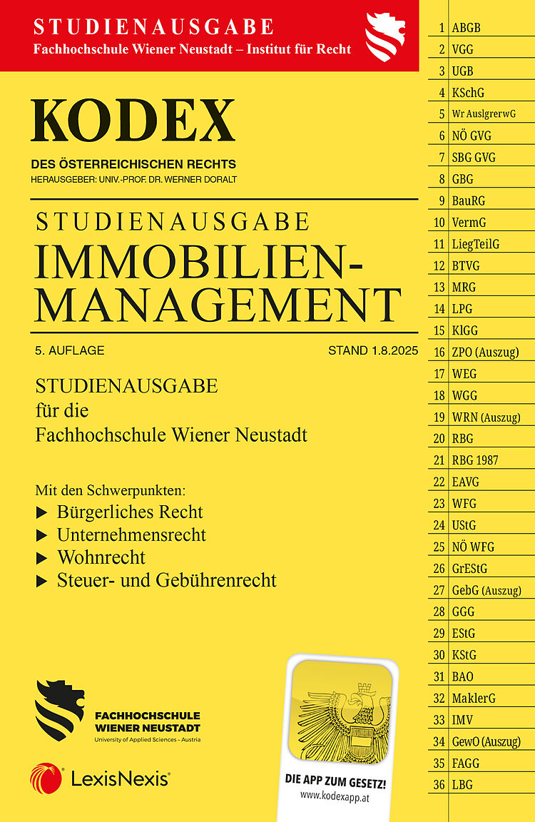 Kodex Immobilienmanagement 5. Auflage mit Stand 1. 8. 2025 enthält: die Gesetzesestimmungen für die Bereiche Immobilien- und Vertragsrecht, Wohnrecht, Immobilienbilanzierung und - besteuerung, Immobilienvermittlung und -vermarktung STUDIENAUSGABE für die FH W...
