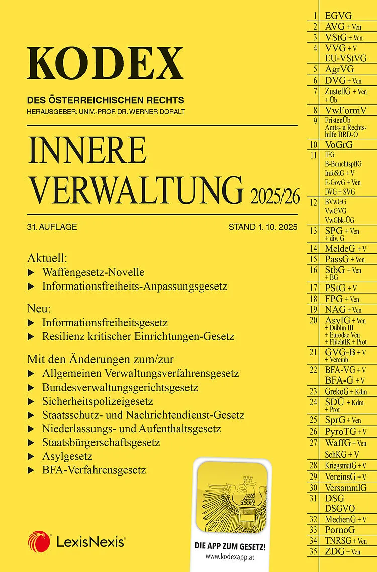 Der Kodex Innere Verwaltung 2025/26, 31. Auflage, mit dem Stand 1. 10. 2025, enthält: Aktuell: Waffengesetz-Novelle Informationsfreiheits-Anpassungsgesetz Neu: Informationsfreiheitsgesetz Resilienz kritischer Einrichtungen-Gesetz Mit den Änderungen zum/zur Al...