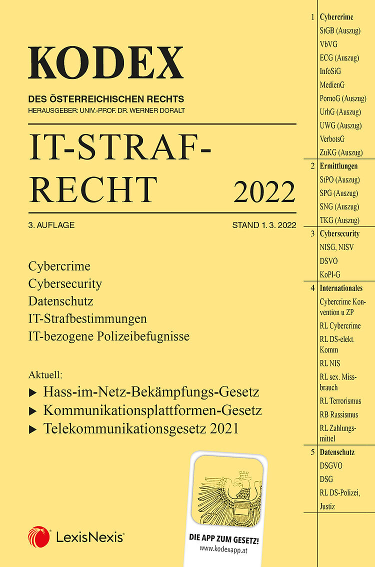 Der Kodex IT-Strafrecht, 3. Auflage mit Stand 1. 3. 2022 enthält: Cybercrime Cybersecurity Datenschutz IT-Strafbestimmungen IT-bezogene Polizeibefugnisse Mit dem Kauf dieses Bandes erhalten Sie Zugriff auf diesen in der KODEX-App . Darin stehen Ihnen die Inha...