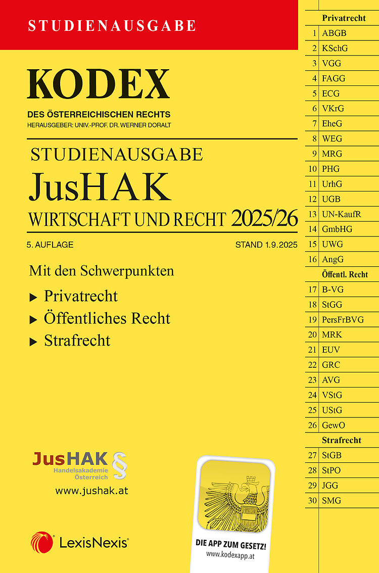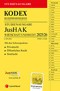 Die Studienausgabe KODEX JusHAK 2025/26 , Stand 1. 9. 2025 bietet allen Schülerinnen und Schülern der Handelsakademie für Wirtschaft und Recht (JusHAK) eine besonders preiswerte Gesetzesausgabe für ihren Unterricht an den Standorten in Eisenstadt, Innsbruck, ...