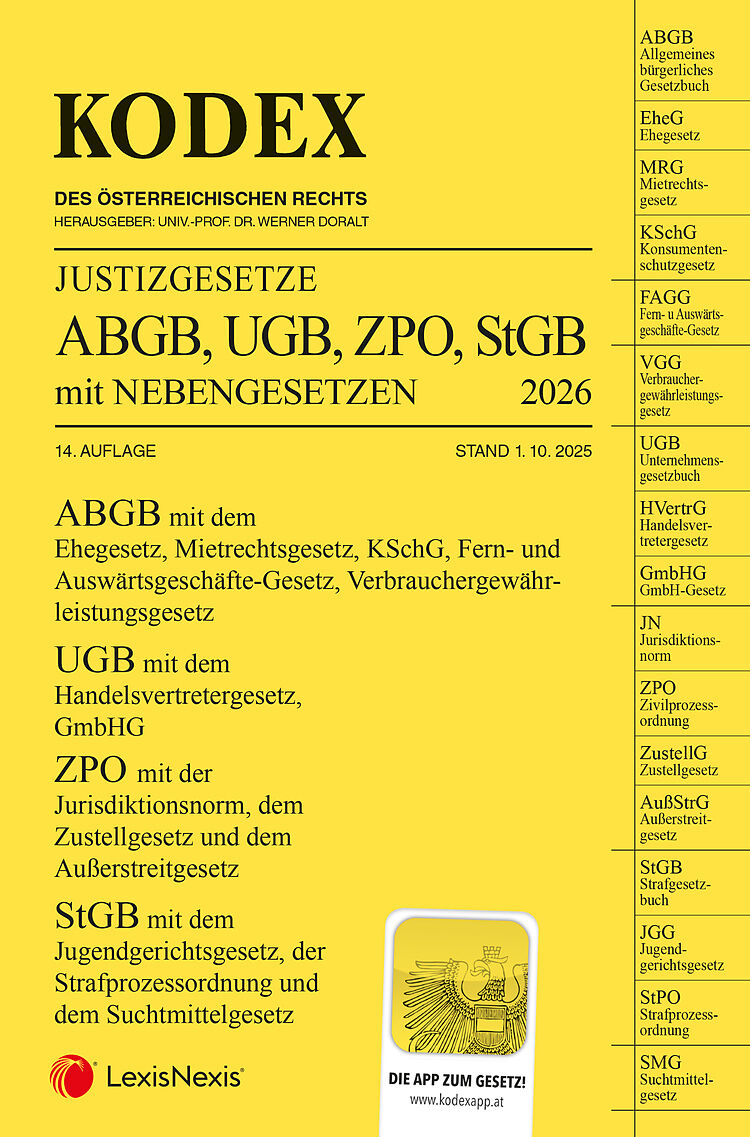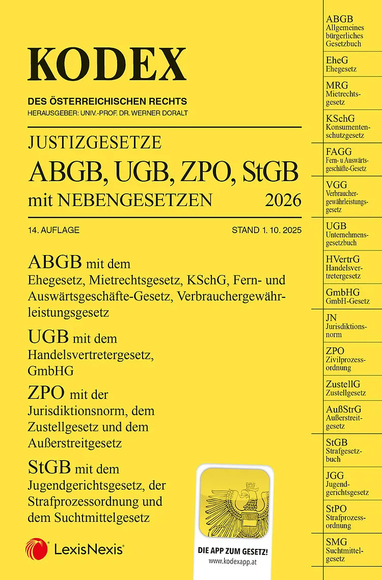 Der KODEX JUSTIZGESETZE 2026 ABGB, UGB, ZPO, StGB mit NEBENGESETZEN, 14. Auflage, Stand 1. 10. 2025 enthält die Hauptgesetze und wichtigsten Nebengesetze aus den Bänden Bürgerliches Recht, Unternehmensrecht, Zivilprozessrecht und Strafrecht. Damit soll dem Pr...
