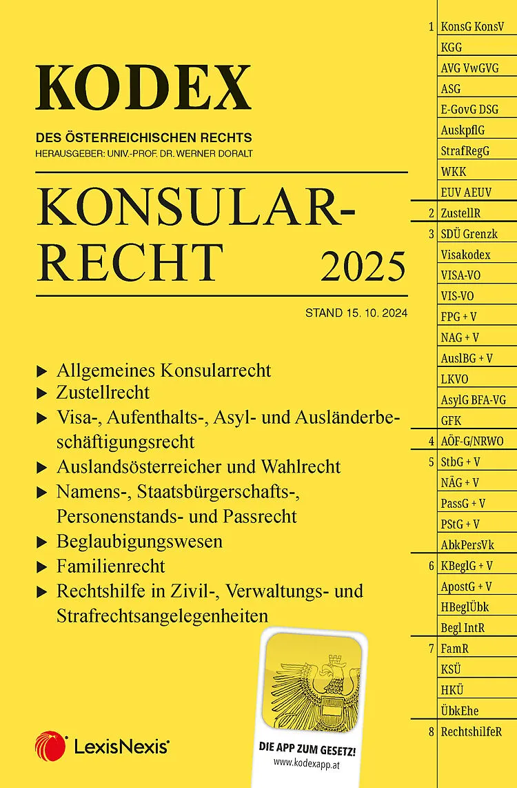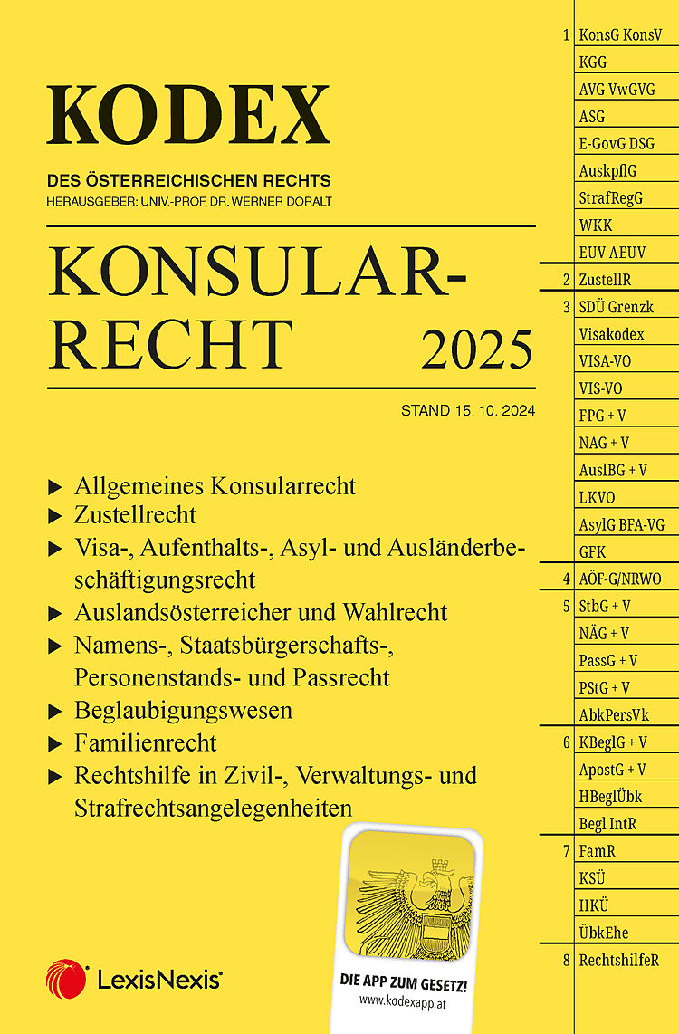 Der neue KODEX Konsularrecht, Stand 15. 10. 2024 bietet eine Zusammenstellung der für das österr. Konsularwesen relevanten Bestimmungen; dabei wurde ebenso viel Gewicht darauf gelegt, alle wichtigen Rechtstexte aufzunehmen, wie darauf, weitgehend bedeutungslo...