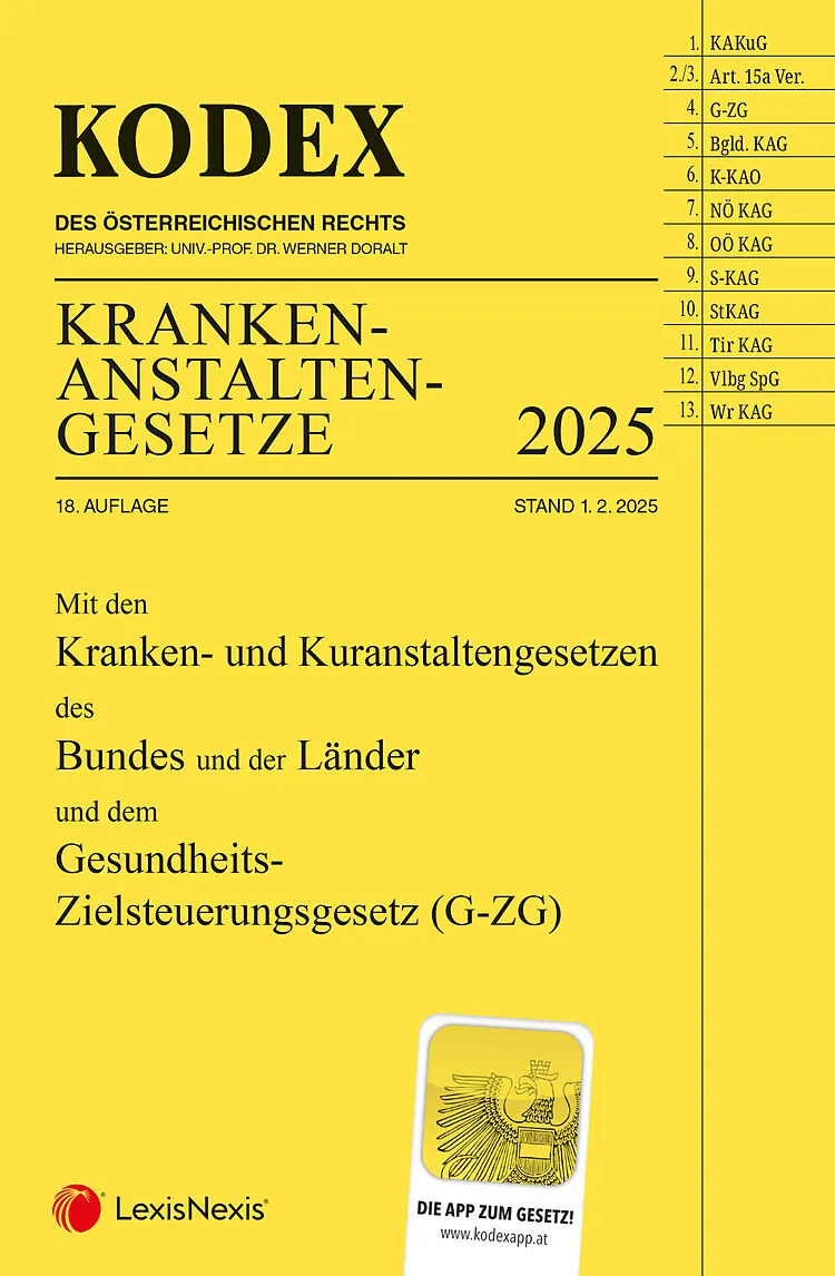 KODEX Krankenanstalten 2025 , 18. Auflage, Stand 1. 2. 2025 Aktuell: Vereinbarungsumsetzungsgesetz 2024 VUG 2024 und die Ausführungsgesetze der Länder mit den jeweils ergangenen Neuerungen Neu: die Vereinbarung gemäß Art. 15a B-VG über die Organisation und Fi...