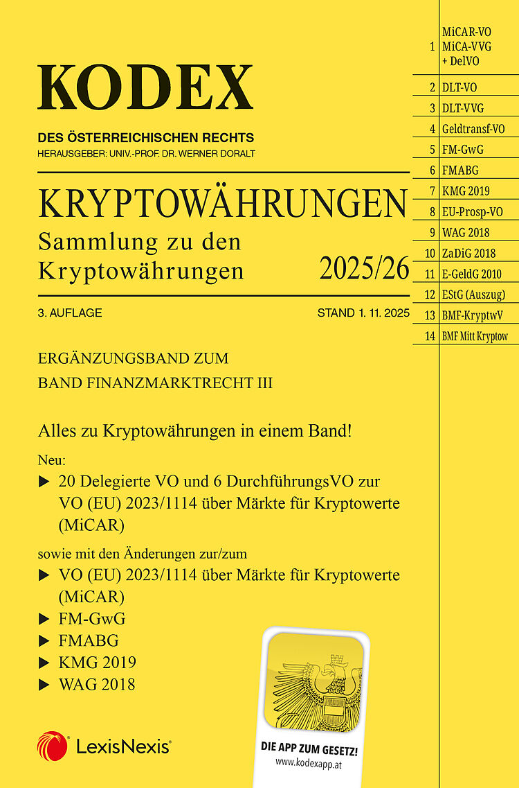 Der Kodex Kryptowährungen 2025/26, 3. Auflage, mit dem Stand 1. 11. 2025 , enthält: ERGÄNZUNGSBAND ZUM BAND FINANZMARKTRECHT III Alles zu Kryptowährungen in einem Band! Neu: 20 Delegierte VO und 6 DurchführungsVO zur VO (EU) 2023/1114 über Märkte für Kryptowe...