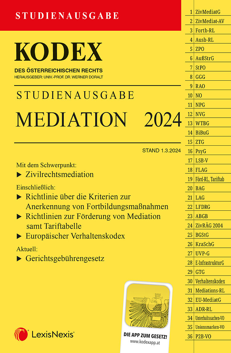 Der Kodex Studienausgabe Mediation mit Stand 1. 3. 2024 enthält: Mit dem Schwerpunkt: Zivilrechtsmediation Einschließlich: Richtlinie über die Kriterien zur Anerkennung von Fortbildungsmaßnahmen Richtlinien zur Förderung von Mediation samt Tariftabelle Europä...