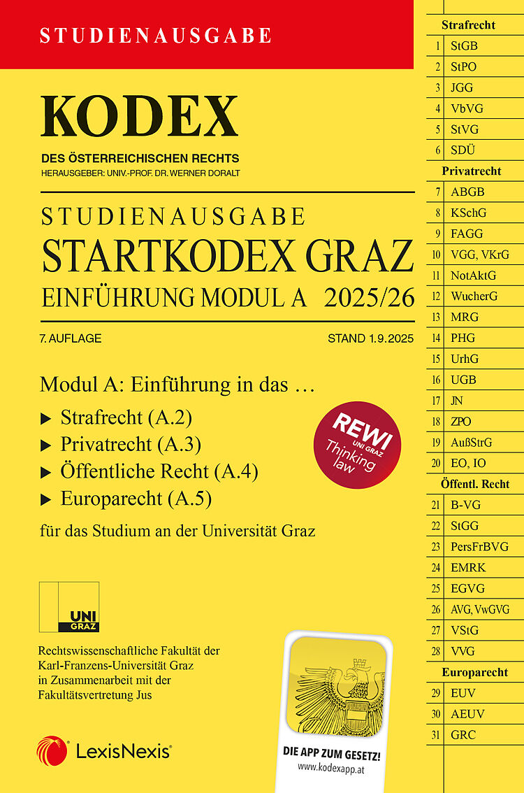 STUDIENAUSGABE für die Karl-Franzens-Universität GRAZ STARTKODEX GRAZ 2025/26 , 7. Auflage Stand 1. 9. 2025 EINFÜHRUNG MODUL A Modul A: Einführung in das - Strafrecht (A.2) - Privatrecht (A.3) - Öffentliche Recht (A.4) - Europarecht (A.5) für das Studium an d...