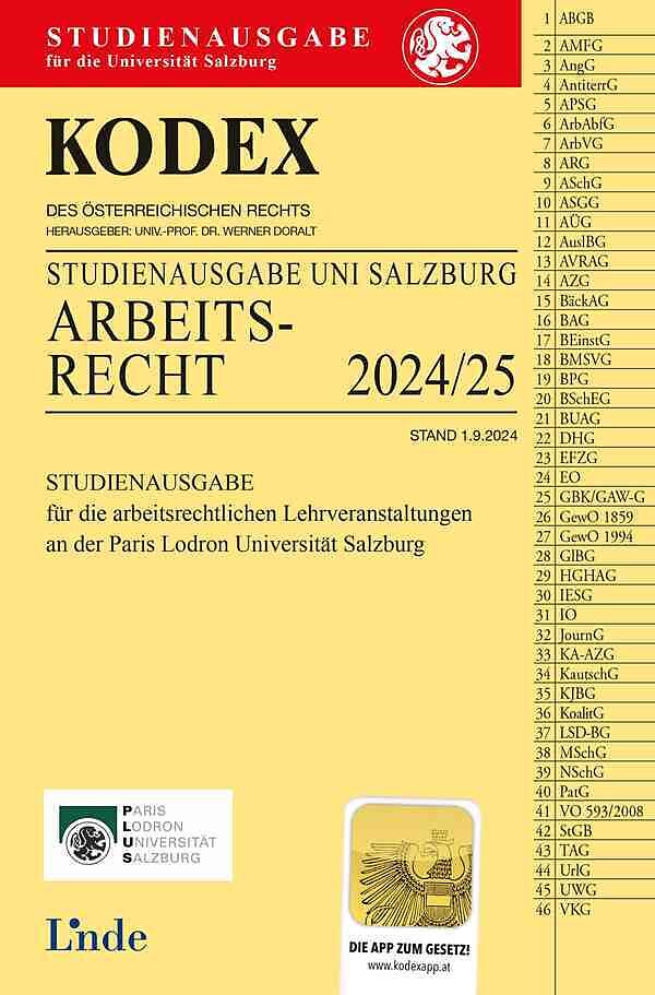 Auflage, Stand 1.9.2024 Mit der App zum Gesetz Die Studienausgabe des KODEX Arbeitsrecht für die arbeitsrechtlichen Lehrveranstaltungen an der Paris Lodron Universität Salzburg. KODEX Studienausgabe Arbeitsrecht 2024/25 STUDIENAUSGABE für die Universität S...