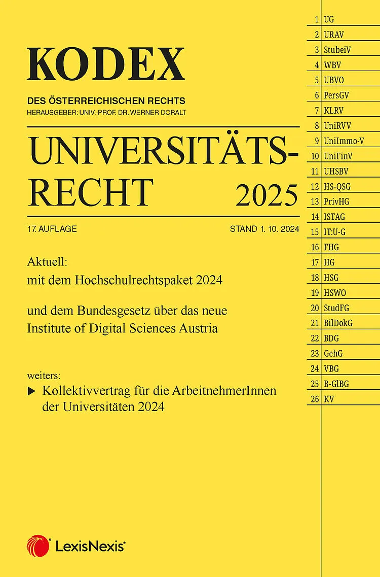 Kodex Universitätsrecht, 17. Auflage, Stand 1. 10. 2024 Aktuell: mit dem Hochschulrechtspaket 2024 und dem Bundesgesetz über das neue Institute of Digital Sciences Austria weiters: Kollektivvertrag für die ArbeitnehmerInnen der Universitäten 2024 Mit dem Kauf...