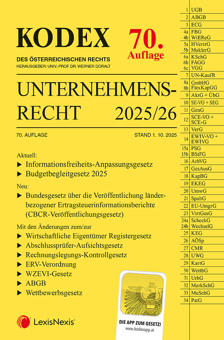 Der Kodex Unternehmensrecht 2025/26, Stand 1. 10. 2025, 70. Auflage, enthält: Aktuell: Informationsfreiheits-Anpassungsgesetz Budgetbegleitgesetz 2025 Neu: Bundesgesetz über die Veröffentlichung länderbezogener Ertragsteuerinformationsbericht (CBCR-Veröffentl...