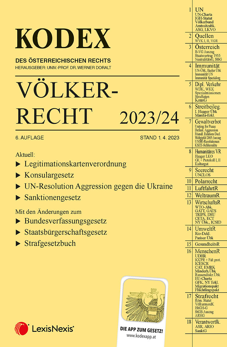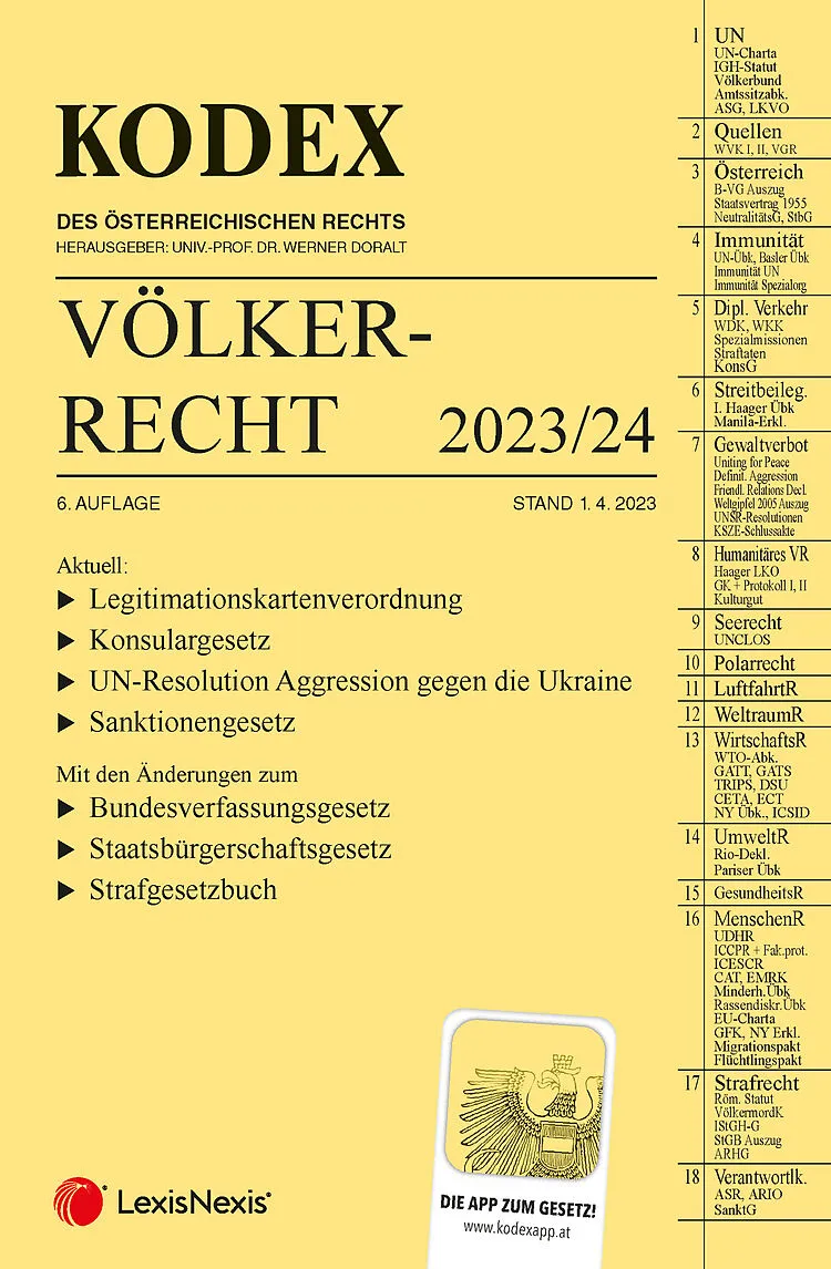 Der Kodex Völkerrecht 6. Auflage mit Stand 1.4.2023 enthält: Recht der Vereinten Nationen, Quellen des Völkerrecht, Nationale Bestimmungen, Recht der Immunität, des Diplomatischen Verkehrs, Bestimmungen über die Streitbeilegung, Resolutionen der UN zum Gewalt...