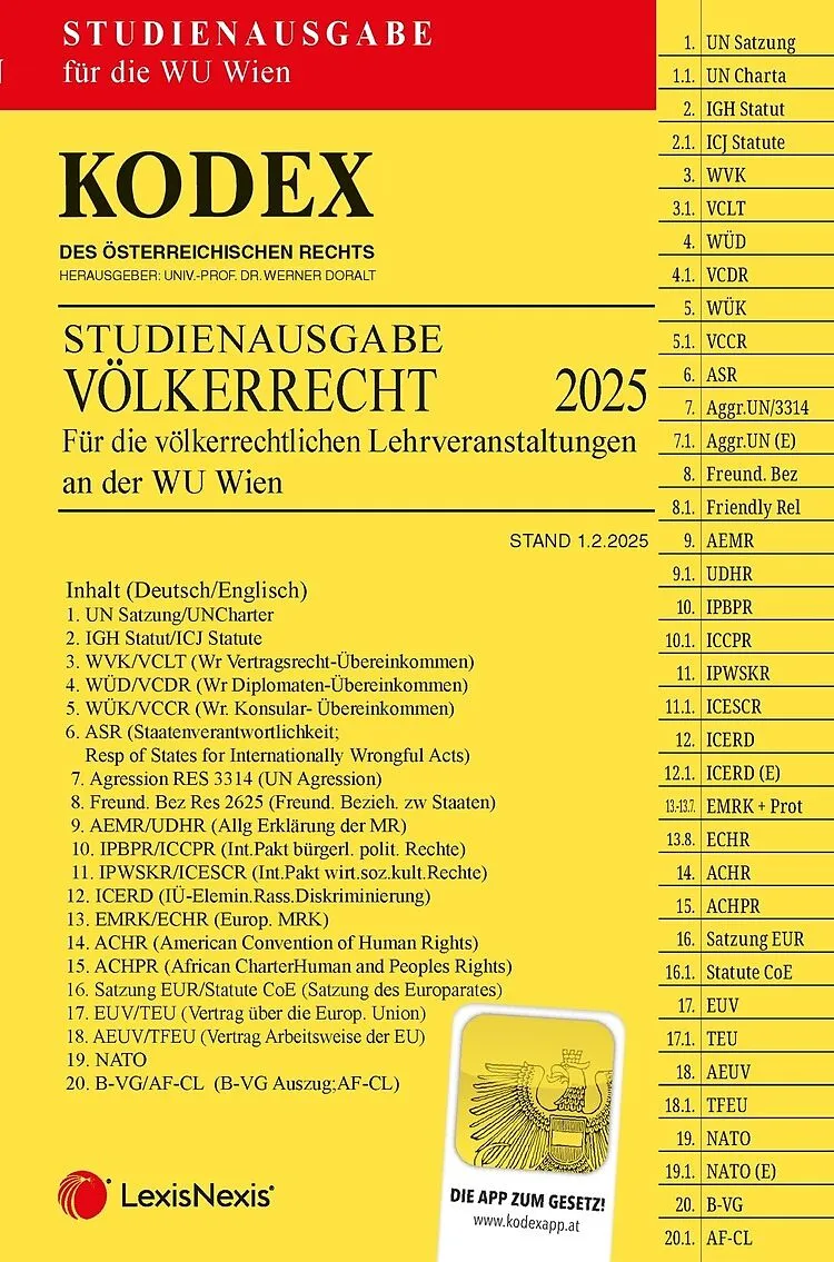 Der Kodex Völkerrecht Studienausgabe für die WU mit Stand 1. 2. 2025 enthält: STUDIENAUSGABE Für die völkerrechtlichen Lehrveranstaltungen an der Wirtschaftsuniversität Wien Inhalt (Deutsch/Englisch) 1. UN Satzung/UNCharter 2. IGH Statut/ICJ Statute 3. WVK/VC...