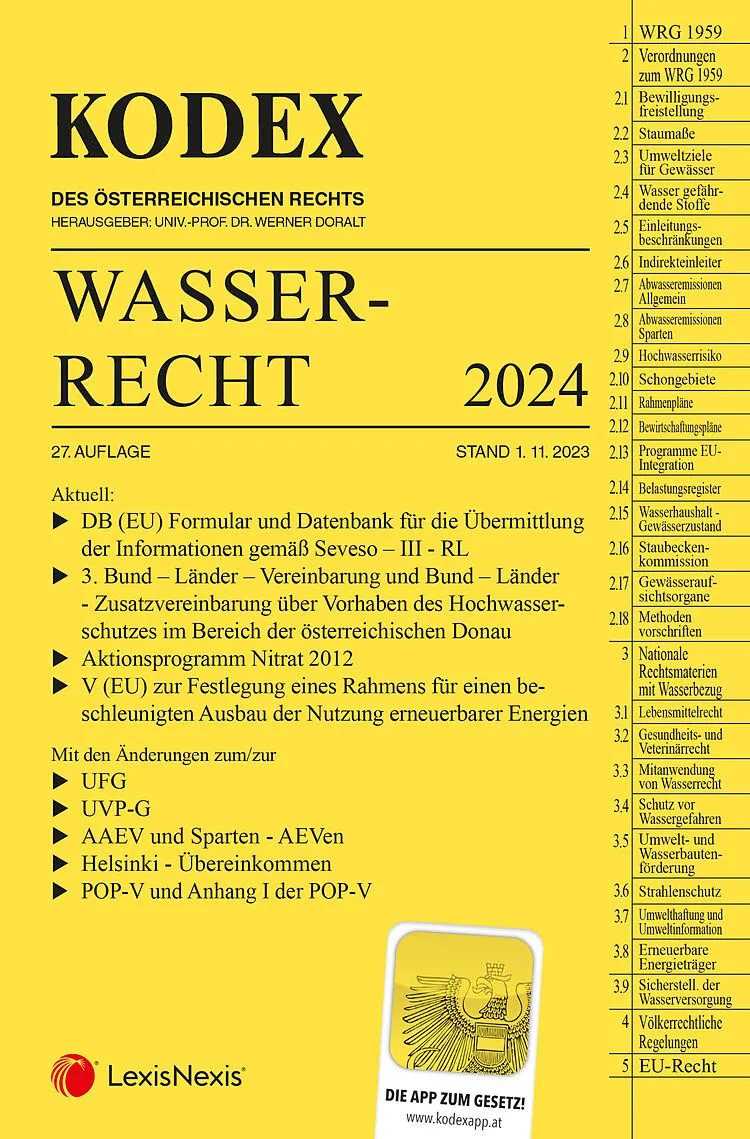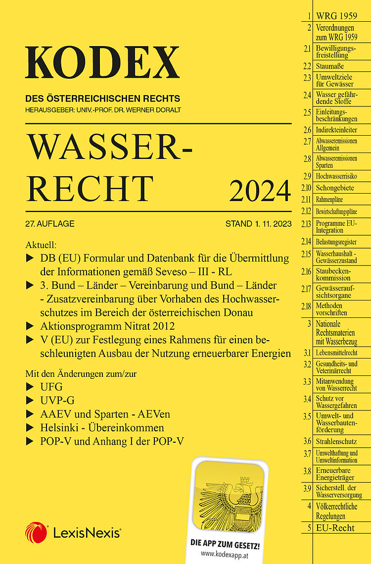 Der Kodex Wasserecht, 27. Auflage mit Stand 1.11.2023 enthält: Aktuell: DB (EU) Formular und Datenbank für die Übermittlung der Informationen gemäß Seveso III - RL 3. Bund Länder Vereinbarung und Bund Länder - Zusatzvereinbarung über Vorhaben des Hochwassersc...