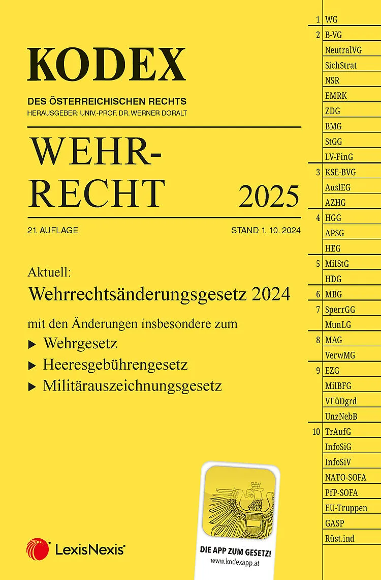 KODEX Wehrrecht 2025, 21. Auflage, Stand 1. 10. 2024Aktuell:Wehrrechtsänderungsgesetz 2024mit den Änderungen insbesondere zum