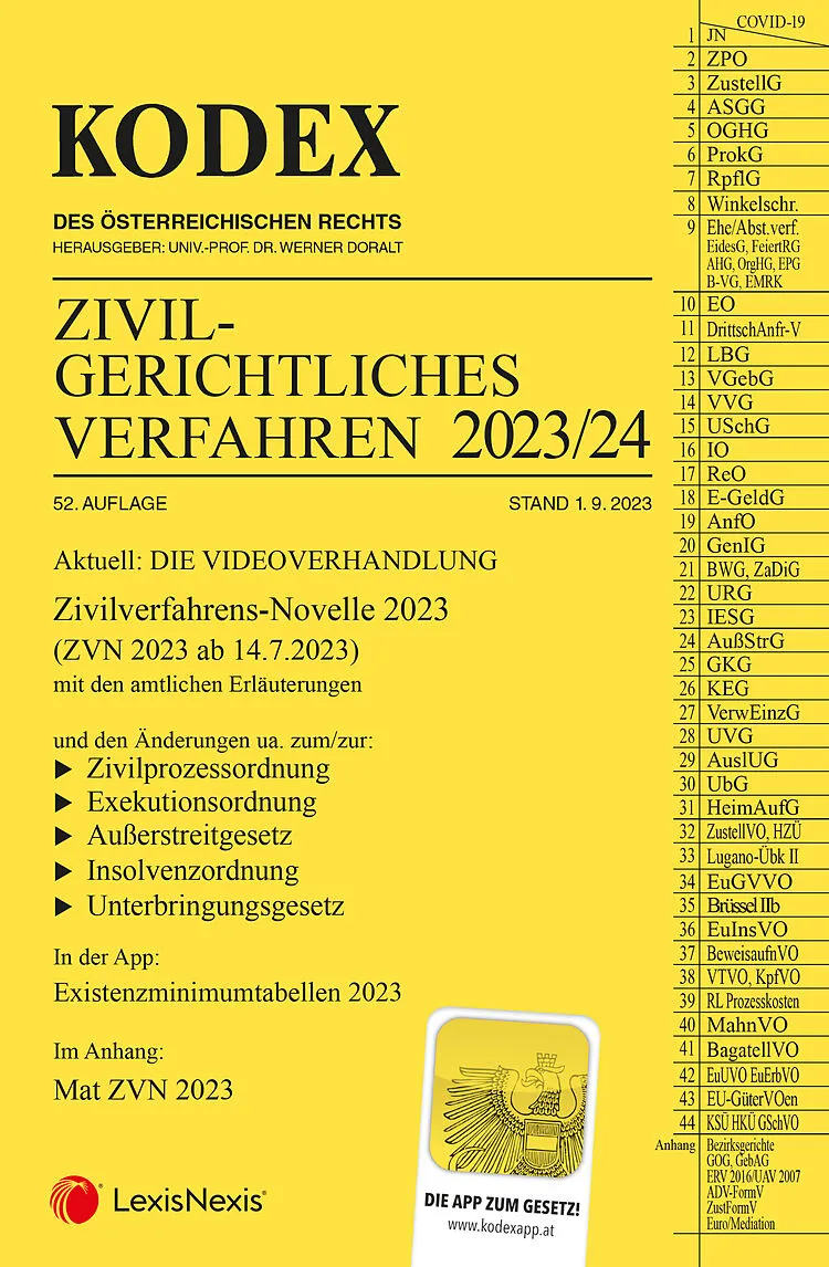 KODEX Zivilgerichtliches Verfahren , 52. Auflage, Stand 1. 9. 2023 Der KODEX Zivilgerichtliches Verfahren ist umfassend dem Zivilverfahrensrecht gewidmet. Der KODEX enthält alle relevanten Stamm- und Nebengesetze aus den Gebieten Zivilprozessrecht (1 9), Exek...