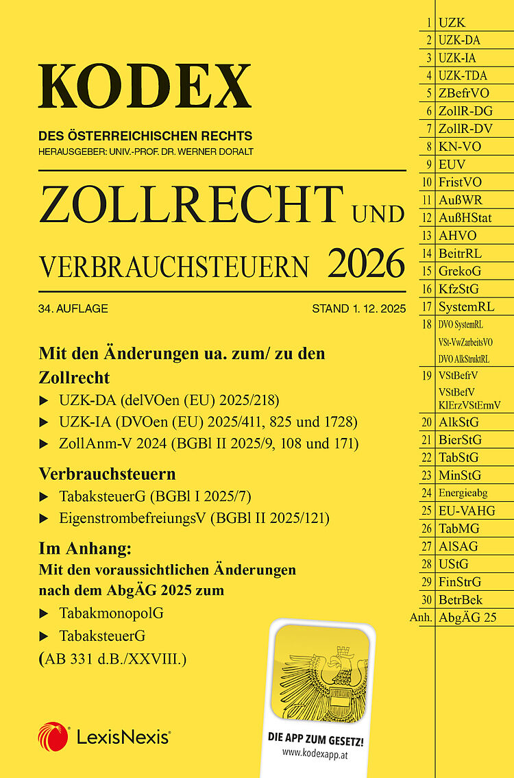 KODEX Zollrecht 34. Auflage, Stand 1. 12. 2025Der KODEX Zollrecht enthält das für Österreich geltende europäische Zollrecht (wie den Zollkodex oder die Zollbefreiungsverordnung) und alle für dieses Rechtsgebiet relevanten nationalen Regelungen. Unter anderem ...
