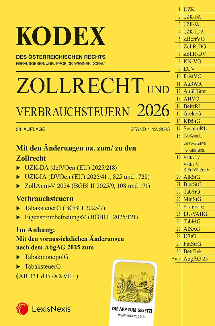 KODEX Zollrecht 34. Auflage, Stand 1. 12. 2025 Der KODEX Zollrecht enthält das für Österreich geltende europäische Zollrecht (wie den Zollkodex oder die Zollbefreiungsverordnung) und alle für dieses Rechtsgebiet relevanten nationalen Regelungen. Unter anderem...