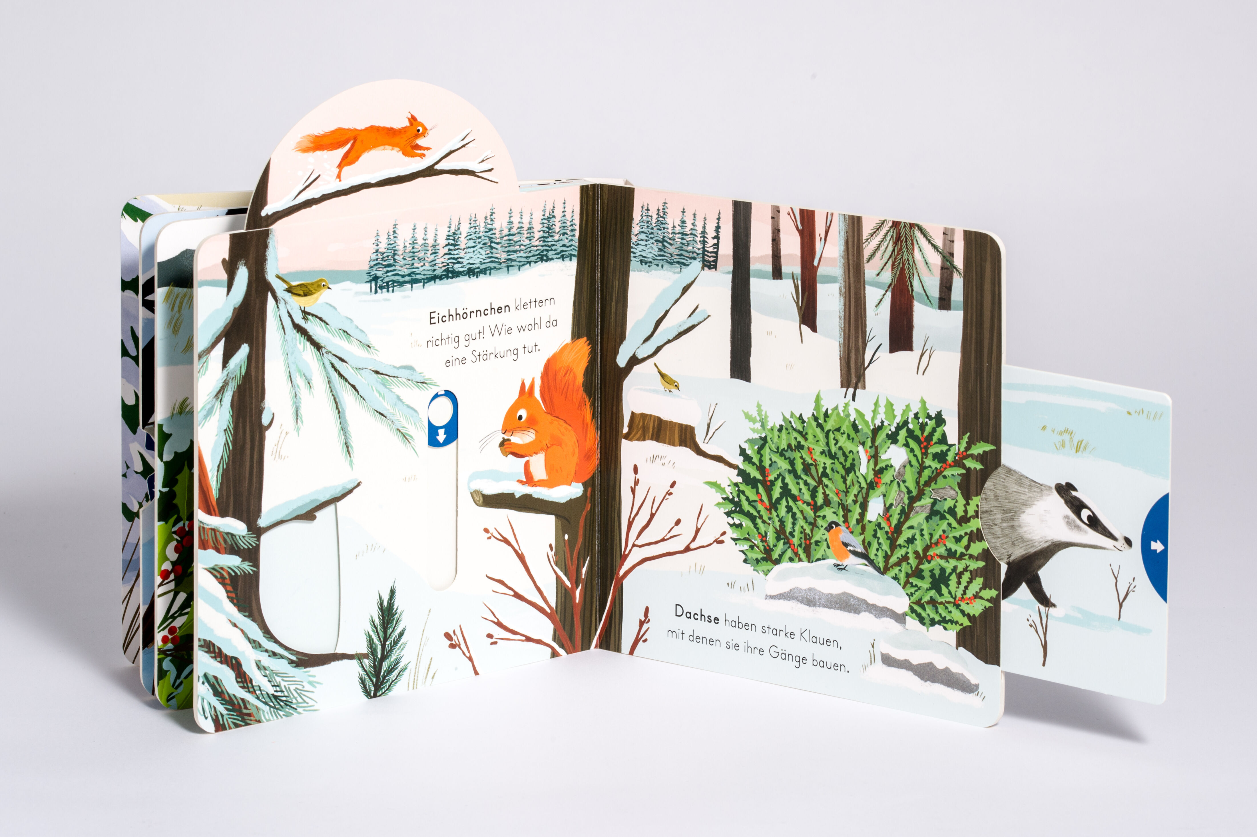 Extraviel Spielspaß und erstes Sachwissen in einem Buch! Hirsche, Rotkehlchen, Wiesel oder Eichhörnchen im Schnee gibt es viele Tiere zu entdecken! Mit nur einer Handbewegung kann das Kind die Tiere von Ast zu Ast hüpfen, nach Futter suchen oder fliegen lassen...