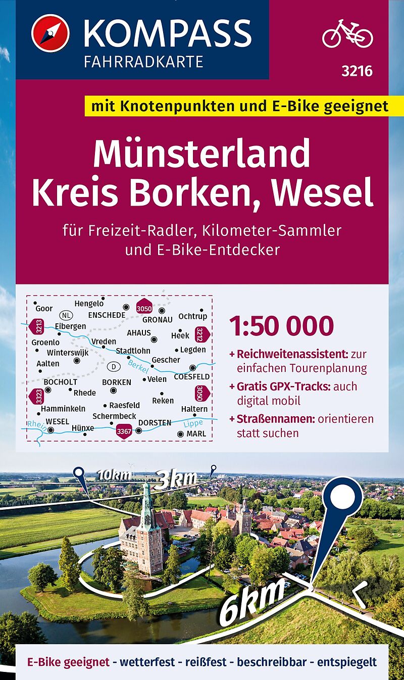 KOMPASS Fahrradkarte 3216 Münsterland, Kreis Borken, Wesel mit Knotenpunkten 1:50.000