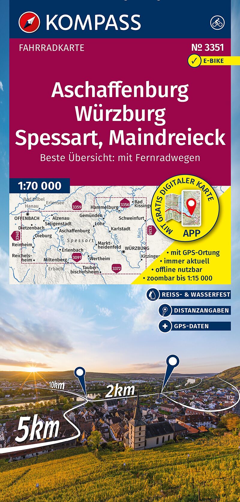Die Fahrradkarte Aschaffenburg, Würzburg, Spessart, Maindreieck von Kompass im Maßstab 1:70.000 bietet einen guten Mix aus Detailgrad und Abdeckung der Region. Sie beinhaltet alles, was man für eine gute Planung und Orientierung einer Fahrradtour benötigt. Da...